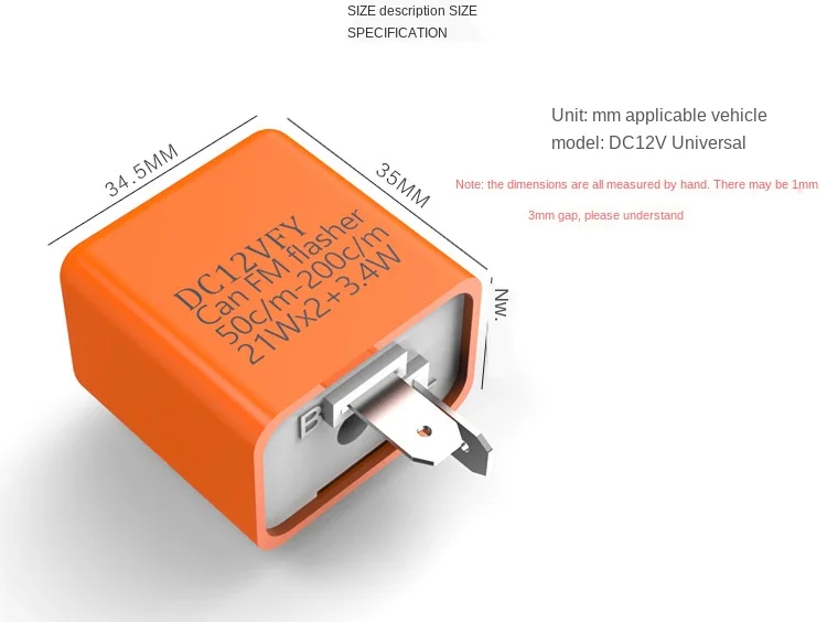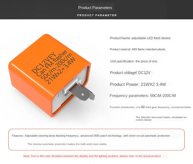 -3 Частоты, быстрее закручивать против часовой стрелки, медленно крутить по часовой стрелке. -Частота мигания: 50 раз/мин --- 200 раз/мин -Рабочая температура: от-40 °C до + 80 °C -- Напряжение: 12 В постоянного тока -- Мощность: 42W + 3,4 W -- Гнездо: 2 контакта -Цвет: оранжевый/черный (случайный цвет) 1. Непосредственно заменить двухконтактный мигалка 2. Светодиодный индикатор позволяет мигать при нормальной скорости 3. Работает для большинства мотоциклов/велосипедов, чтобы исправить светодиодный светильник, связанный с сигналом поворота, гипермигающий, не функционирует должным образом. 4. Подходит для всех видов мотоциклов.