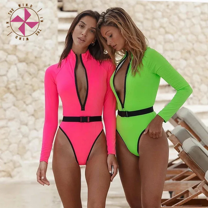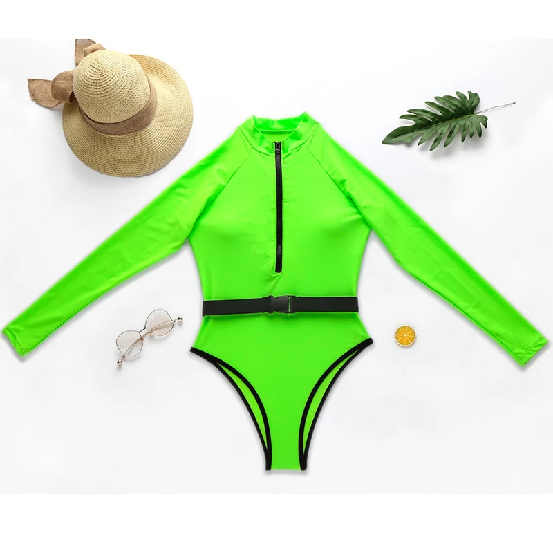 Новый флуоресцентный сексуальный женский купальник с длинным рукавом бикини с поясом молнией цельный бикини Монокини Пляжная одежда купальный костюм