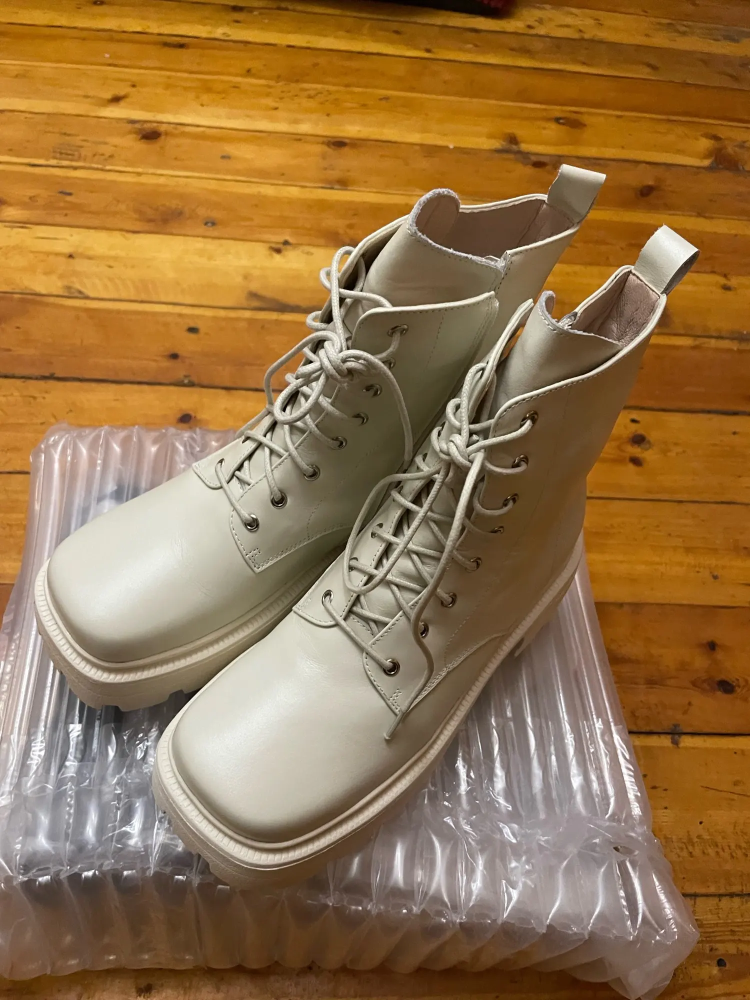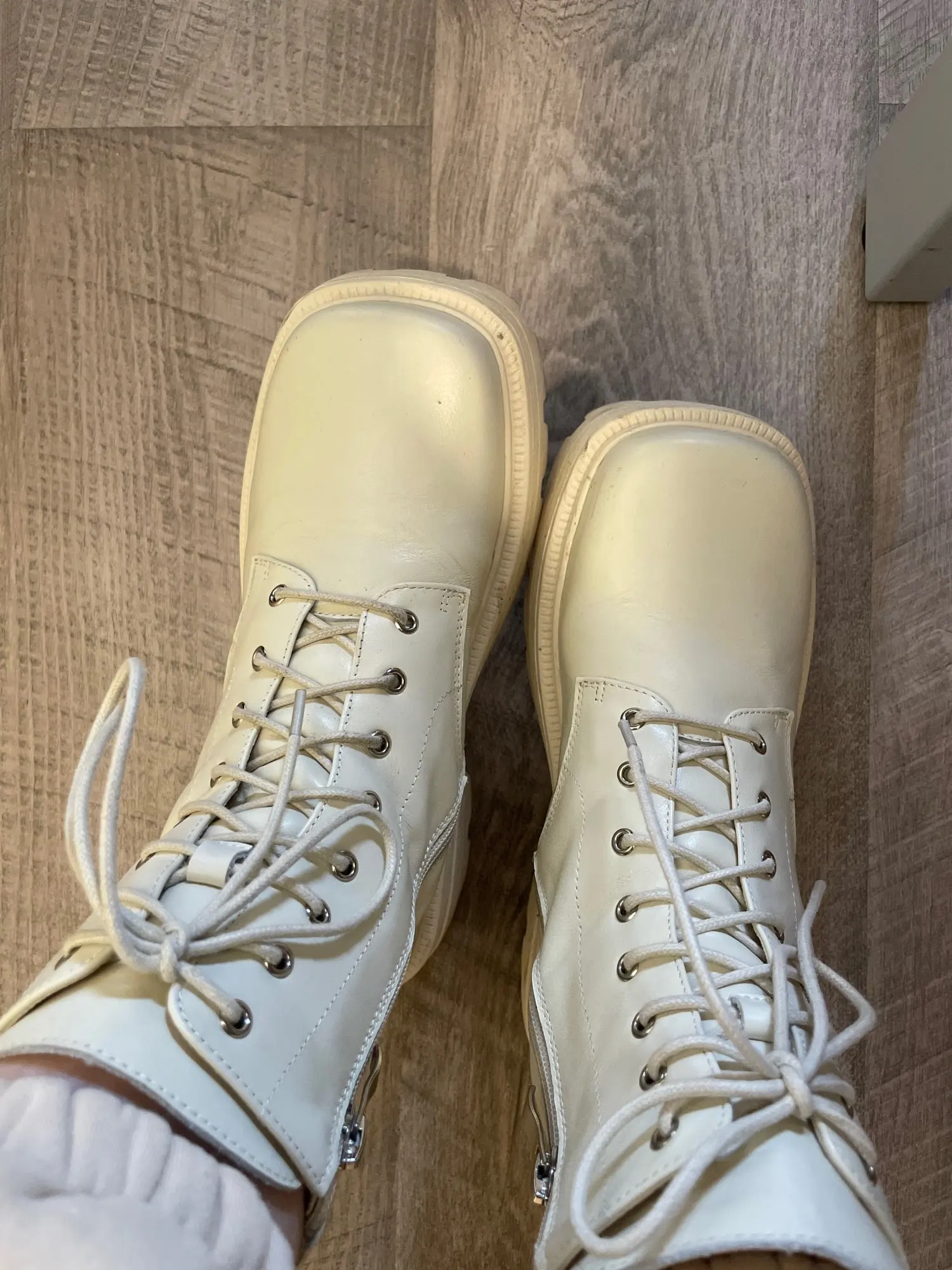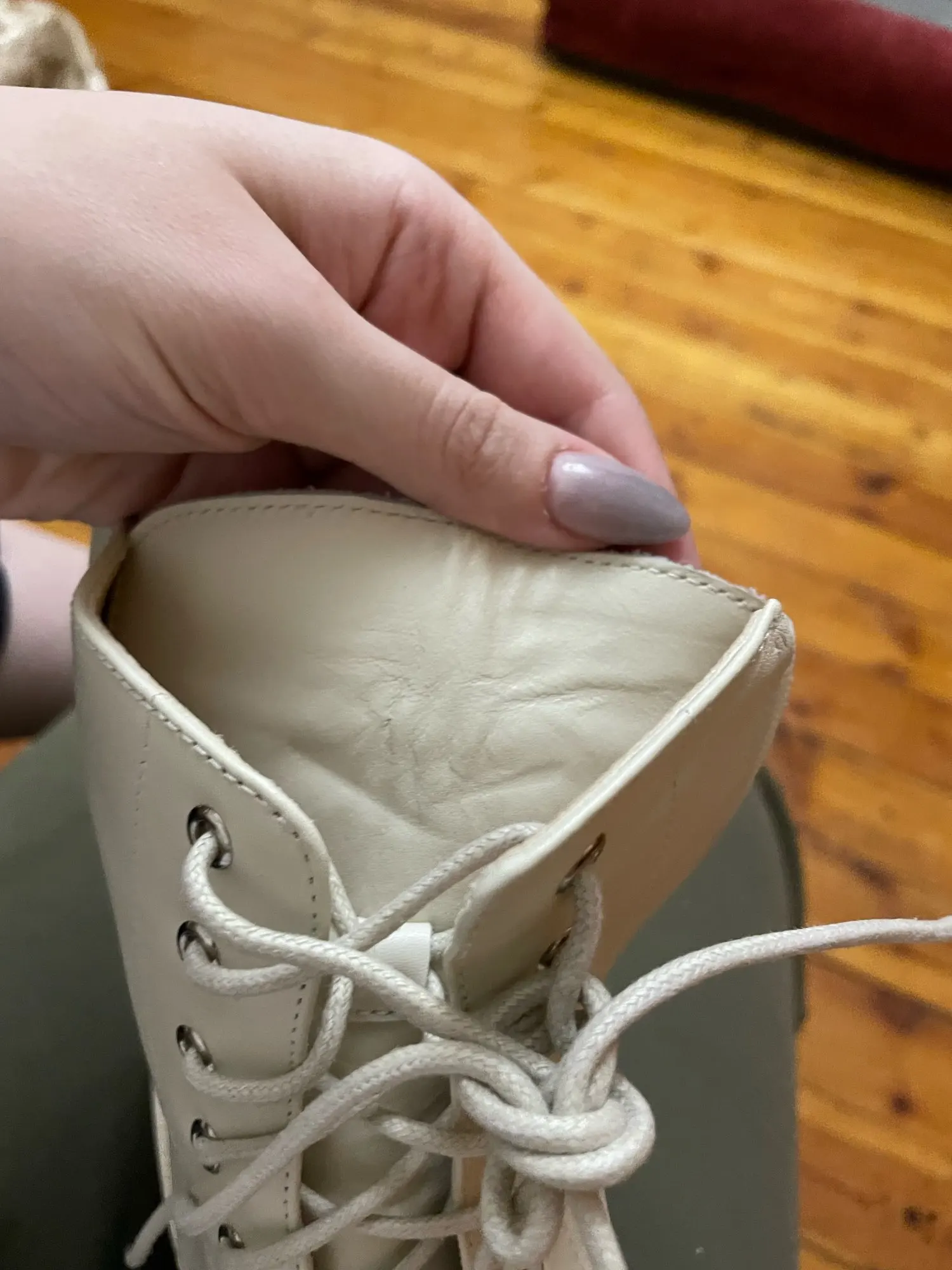 Трескаются на заломах, с подошвой надо быть аккуратней, остаются чёрные полосы и их не возможно оттереть(по крайней мере у меня не получилось) в целом довольно симпатичные. А ещё на белых ботинках были следы от ручки , но все стерлось со временем.