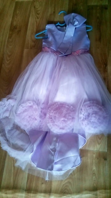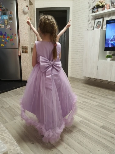 Доставка долгая. На рост 122 взяла заказала 8 с маркировкой 140. По длинне хорошо, а вот в объеме очень велико. Юбка в четыре слоя, не светится. Лиф из тоненькой ткани, немного с отливом, смотрится дешево. Не атлас. Внутри качество пошива мягко сказать не очень. На фото под платьем юбочка ту-ту.