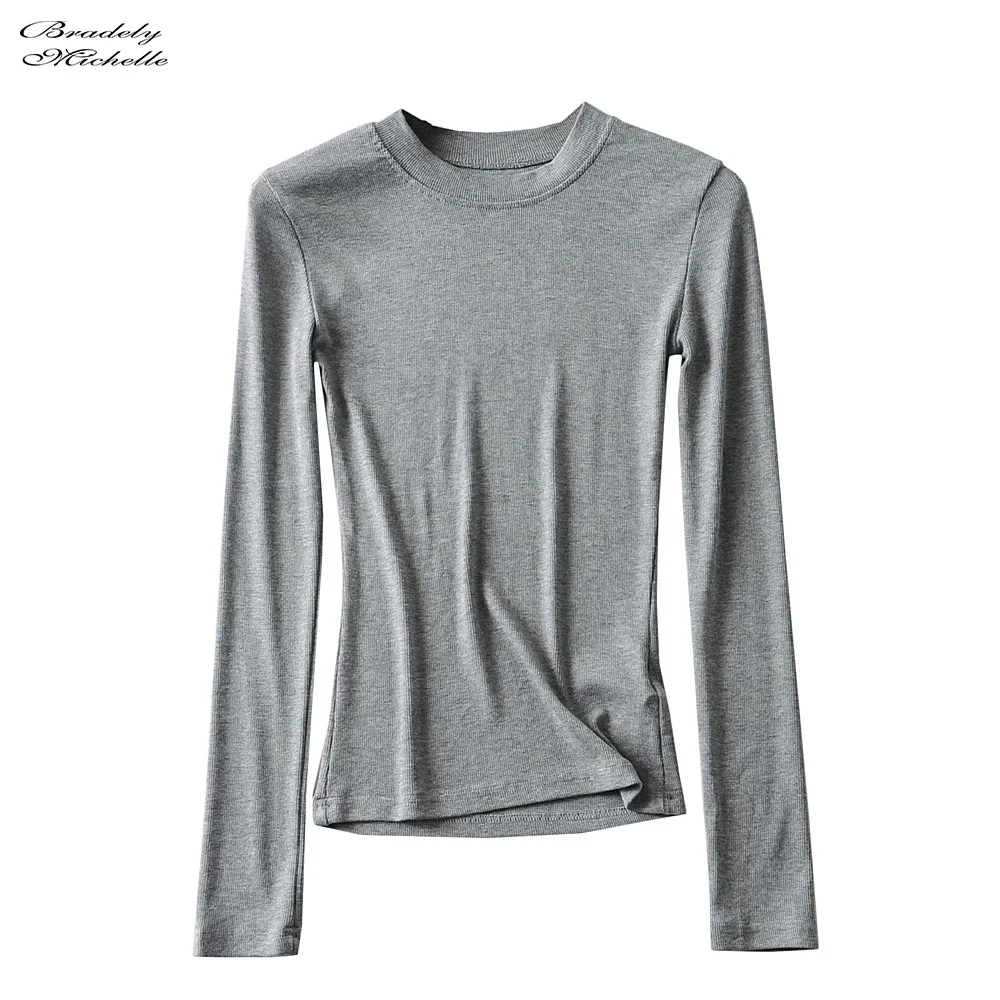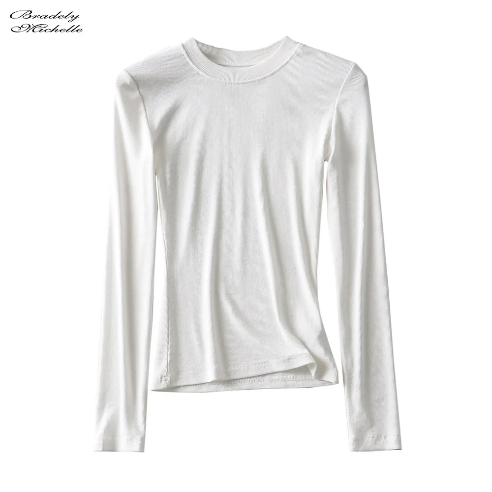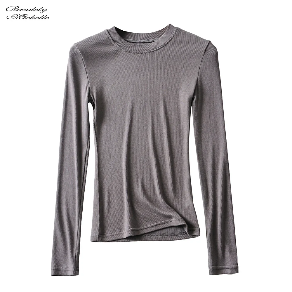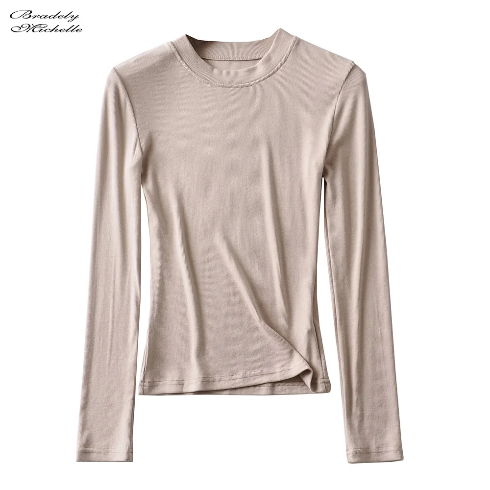 Женская одежда BRADELY MICHELLE 2020, Хлопковые вязаные топы, Повседневная облегающая эластичная футболка с круглым вырезом и длинным рукавом
