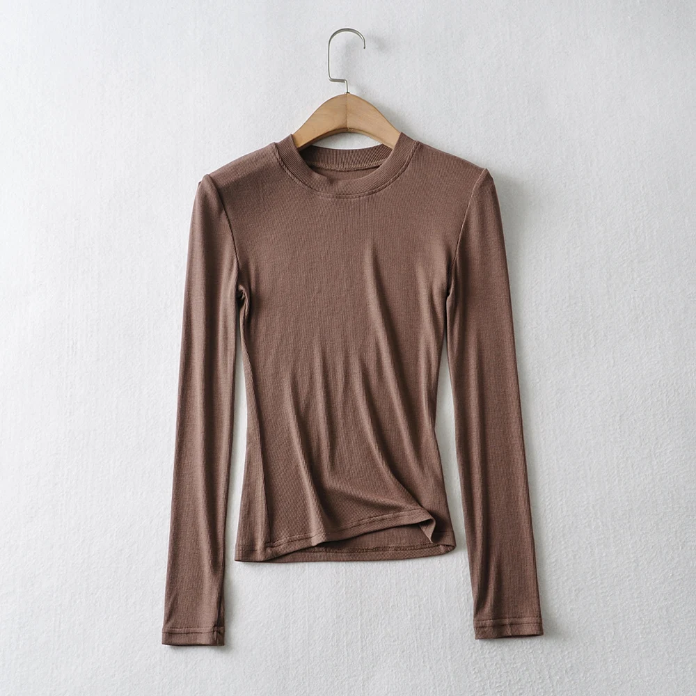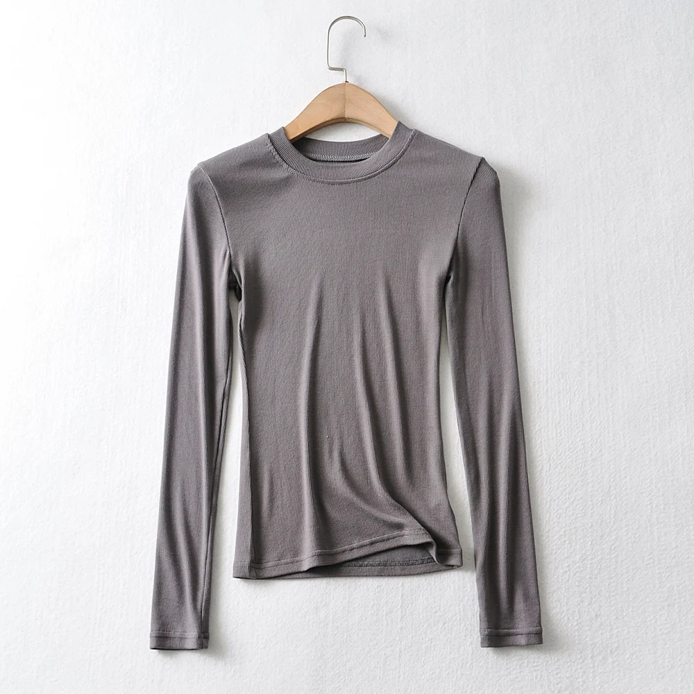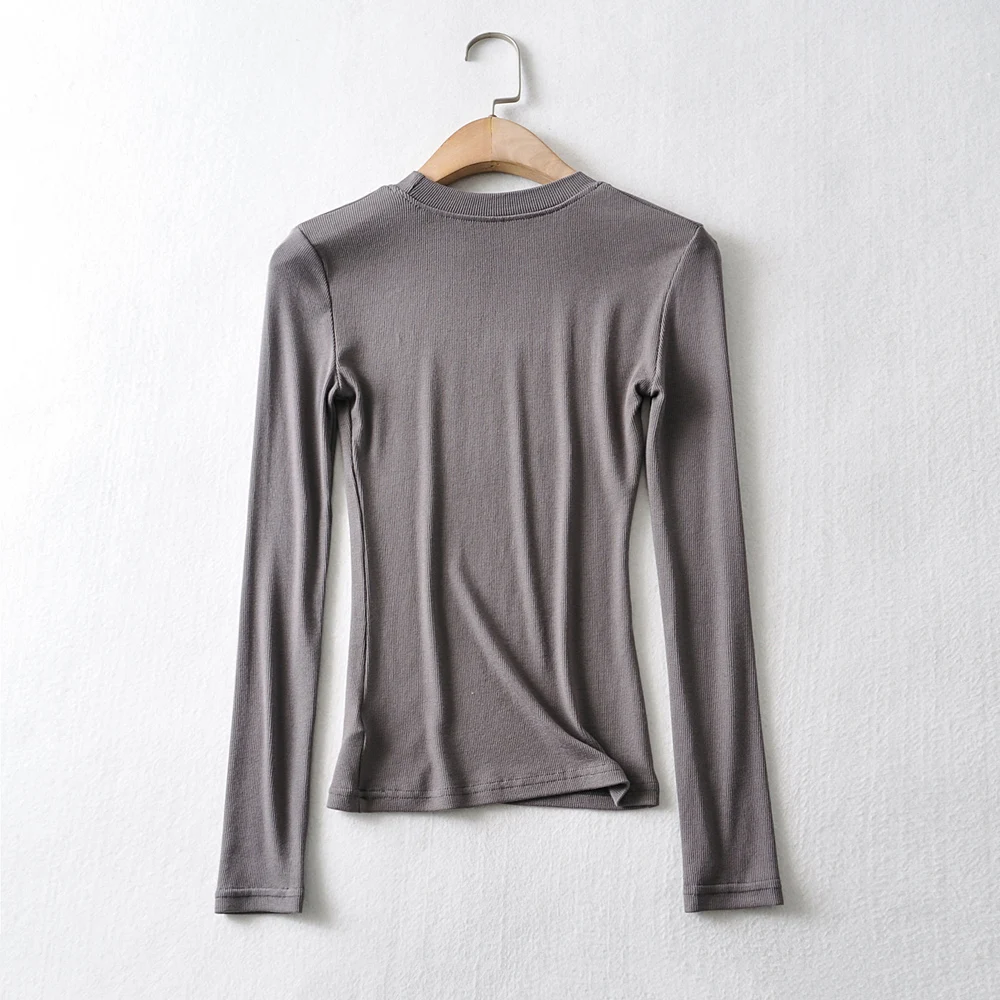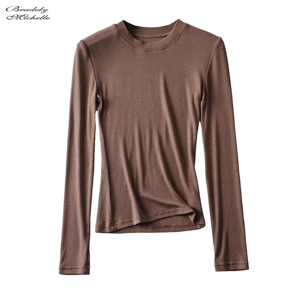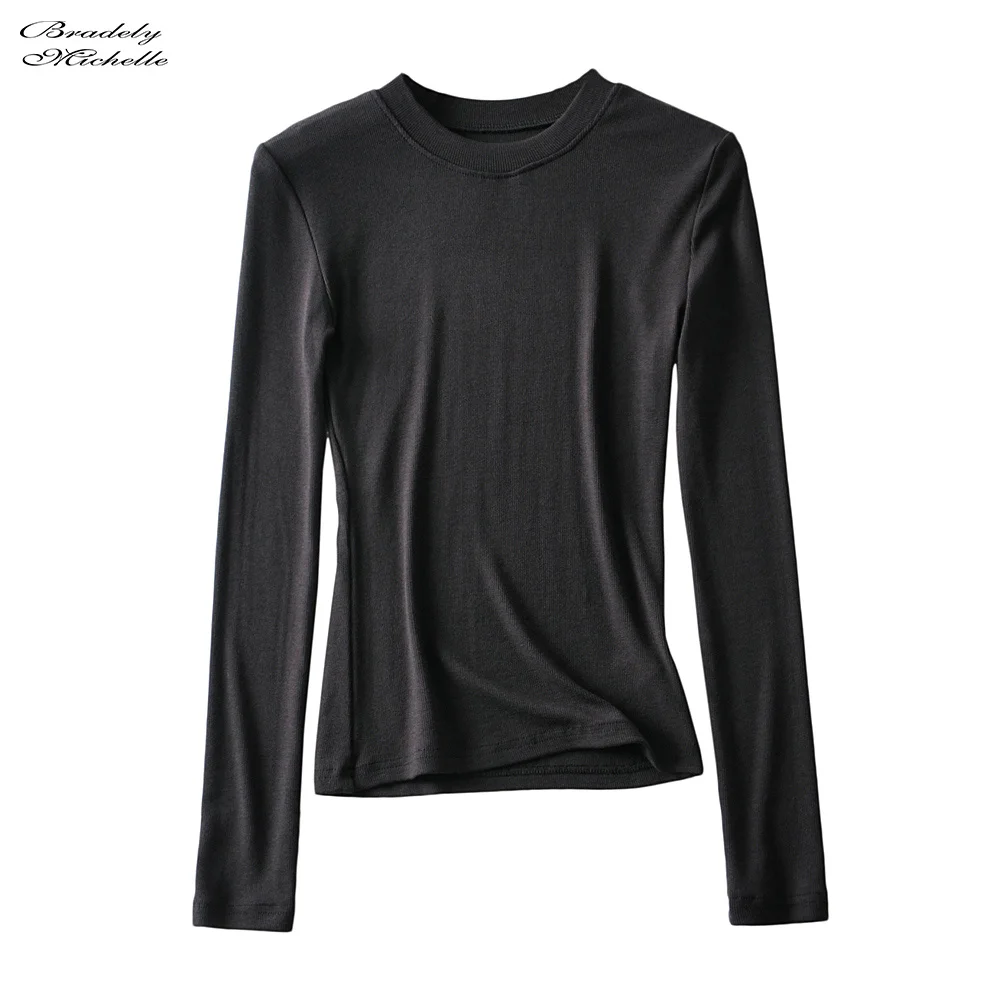 Женская одежда BRADELY MICHELLE 2020, Хлопковые вязаные топы, Повседневная облегающая эластичная футболка с круглым вырезом и длинным рукавом