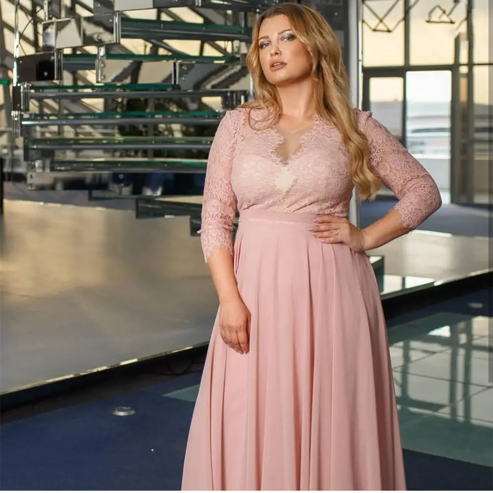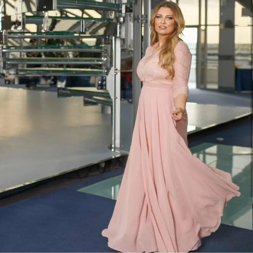 Вечернее платье розовое ТРАПЕЦИЕВИДНОЕ с длинным рукавом 2002 длина в пол шифоновое кружевное платье с аппликацией Великолепная длина в пол для женщин вечерние платья