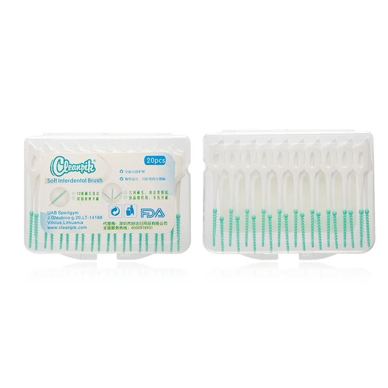 Это набор из 20 межзубных щеток. Зубочистки изготовлены из мягкого, нетоксичного, безопасного, здорового и экологически чистого пищевого материала.