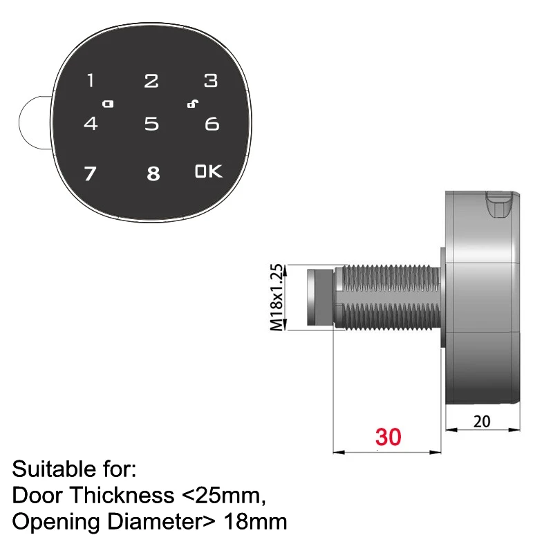 Размер корпуса замка: 20 мм или 30 мм (если деревянная дверца шкафа, 30 мм. Если стальной шкаф, 20 мм)