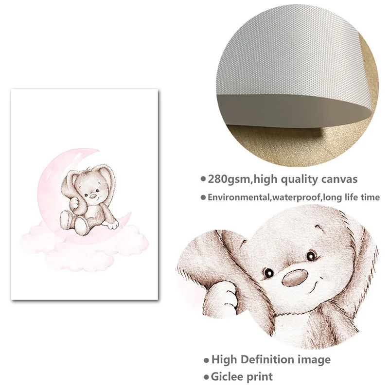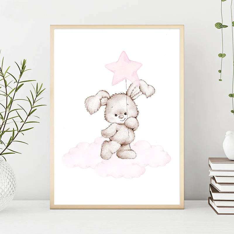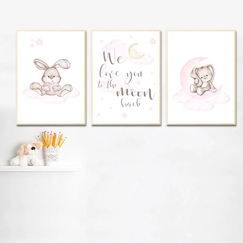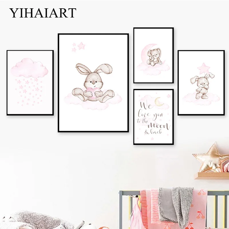 Настенная живопись с изображением розового кролика, постер с изображением кролика, Луны, Детские стихи, в скандинавском стиле, украшение для детской комнаты