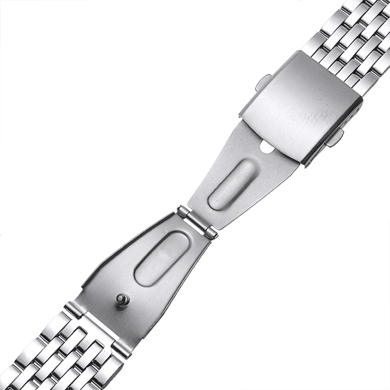 Легко регулировать длину ремешка часов с помощью регулируемых звеньев. Подходит к быстроразъемной застежке, которая имеет кнопку нажатия, чтобы ее открыть. Максимальная длина: около 243 мм Минимальная длина (закрыта): около 175 мм Ширина циферблата часов: 18/20/22 мм для выбора Толщина ремешка: около 4 мм Стиль часов: прямой конец Материал ремешка: нержавеющая сталь Цвет: серебристый 100% новый и высокое качествоПосылка:1x Ремешок для часов из нержавеющей стали