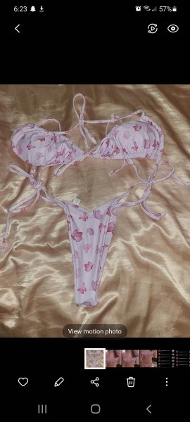 looks exactly like it’s supposed to. i’m 5’3 and 115 pounds and i got a small and it fits very well. bottoms go right up ur ass but the v shape is flattering. the top is super cute but the boob part is sewn in so it doesn’t move so nip slip is very possible. i made mine into a halter top to help but people will probably end up seeing my nipples. i’m not mad at it tho. i got the purple design and it’s cute