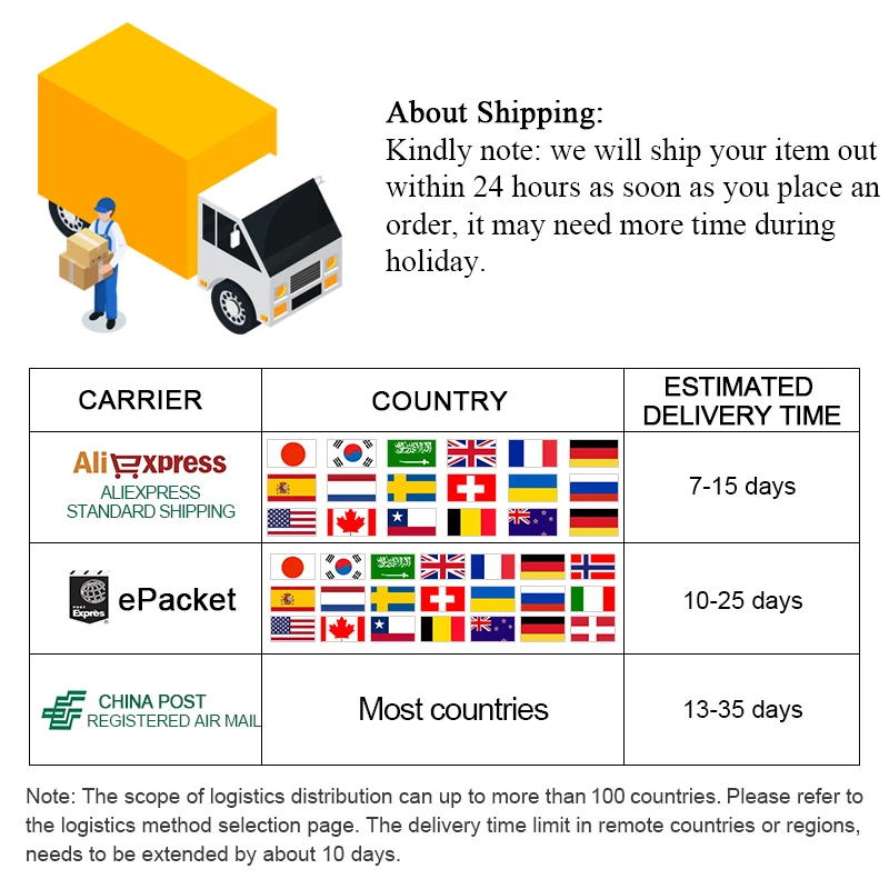 О доставке Обратите внимание: Быстрая доставка: мы отправим ваш товар в течение 24 часов, как только вы разместите заказ, может потребоваться больше времени во время отпуска.