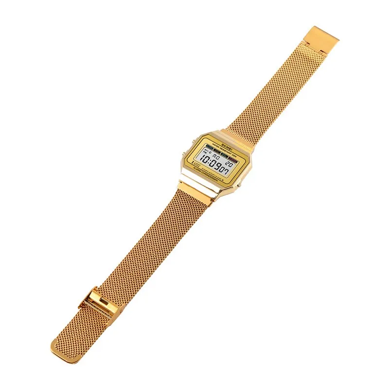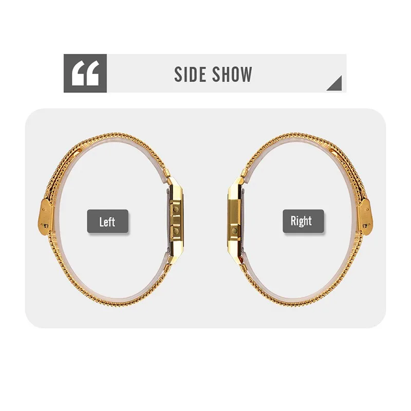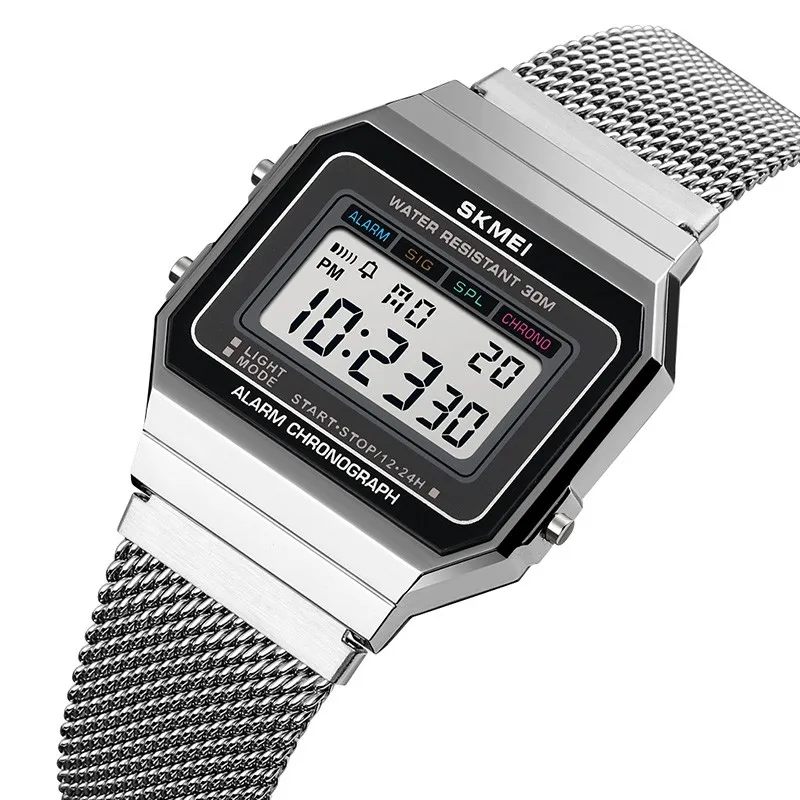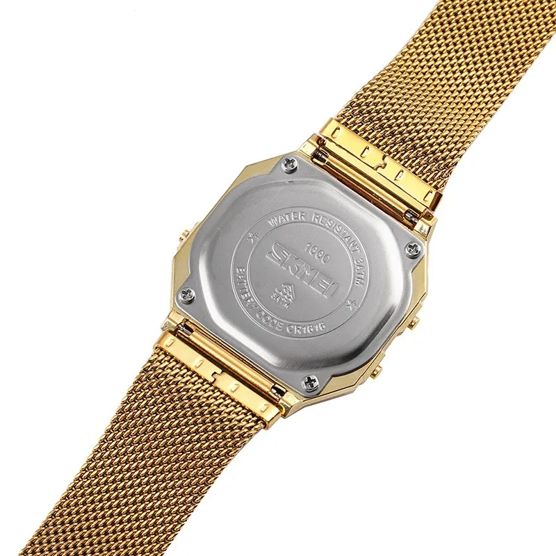 Бренд: SKMEI Материал: Чехол: ABS Ремешок: сплав Зеркало: смола Застежка: сплав Цвет: черный, серебристый, золотой, розовое золото Размер: 240 мм Чехол: 37 мм * 34 мм Толщина корпуса: 7 мм Вес: около 65 г Функции: время, секундомер, светодиодная подсветка, дата, будильник, неделя, почасовый час, 12/24 часов Водонепроницаемость: 30 м Посылка входит: 1 шт * часы 1 шт. * Инструкция Примечание: 1. Из-за ручного измерения и различных методов измерения допускается погрешность в 1-3 см. 2. Из-за разницы между различными мониторами изображение может не отражать реальный цвет продукта.
