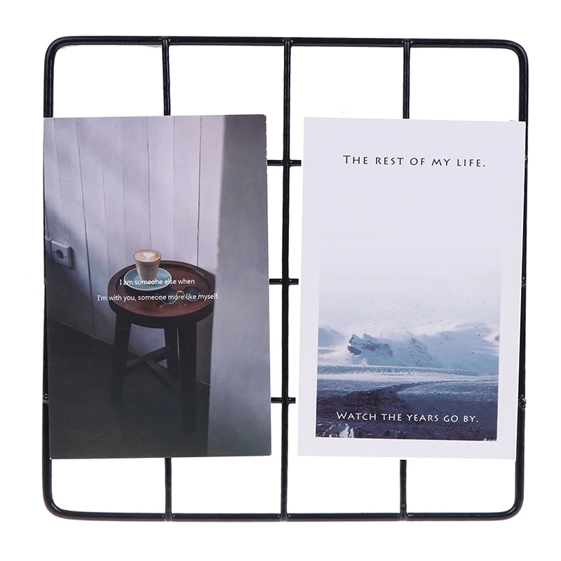 ХарактеристикиНазвание продукта: настенная фоторамка с сеткойМатериал фоторамки: железная проволокаМатериал зажима: деревоЦвет оправы: белый черный