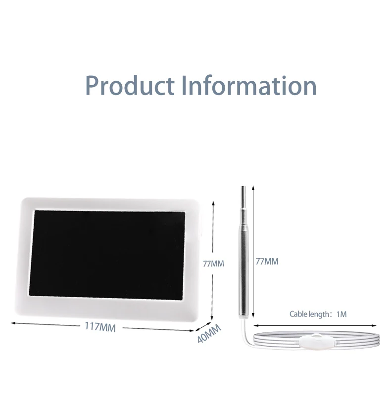 4,3 дюймов ультра высокой четкости-Интегрированный уха * нос * В * зеркалоДомашний самоосмотр/ухо * нос * горло * клиника */инструмент красоты/исследование животных-выделено 7 дюймовые Параметры экрана Разрешение экрана: 1024x600 Емкость аккумулятора экрана: 2800 мАч Время работы экрана: около 3 ч Вход для зарядки экрана: 5 В/1 а постоянного тока 3,9 мм Параметры камеры Разрешение камеры: 1280x720 Камера Фокусное расстояние: 1,4 мм-2,0 мм Водонепроницаемость: IP67 Диаметр и диаметр провода камеры: 2.2.5 мм/1,35 м