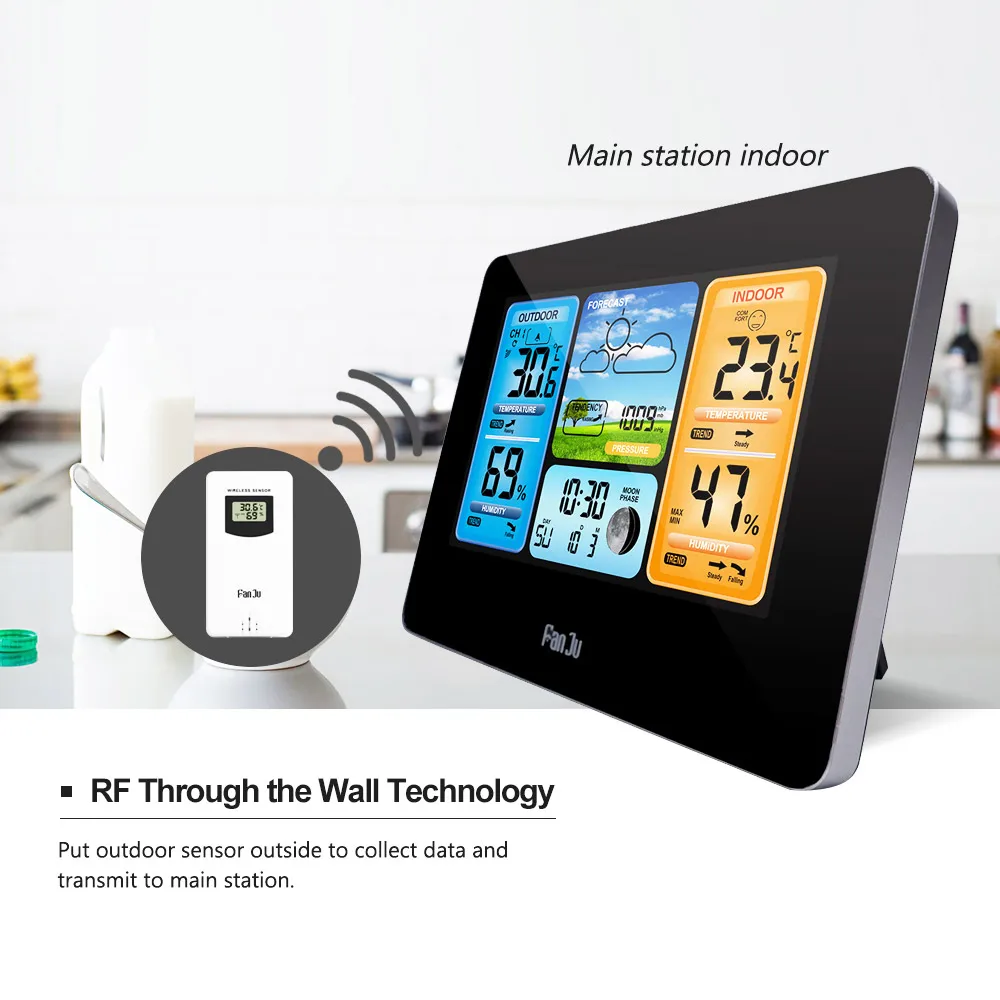 Многофункциональная цифровая метеостанция FJ3373, с ЖК-дисплеем, будильником, для использования в помещении и на улице, с прогнозом погоды, барометром, термометром, гигрометром