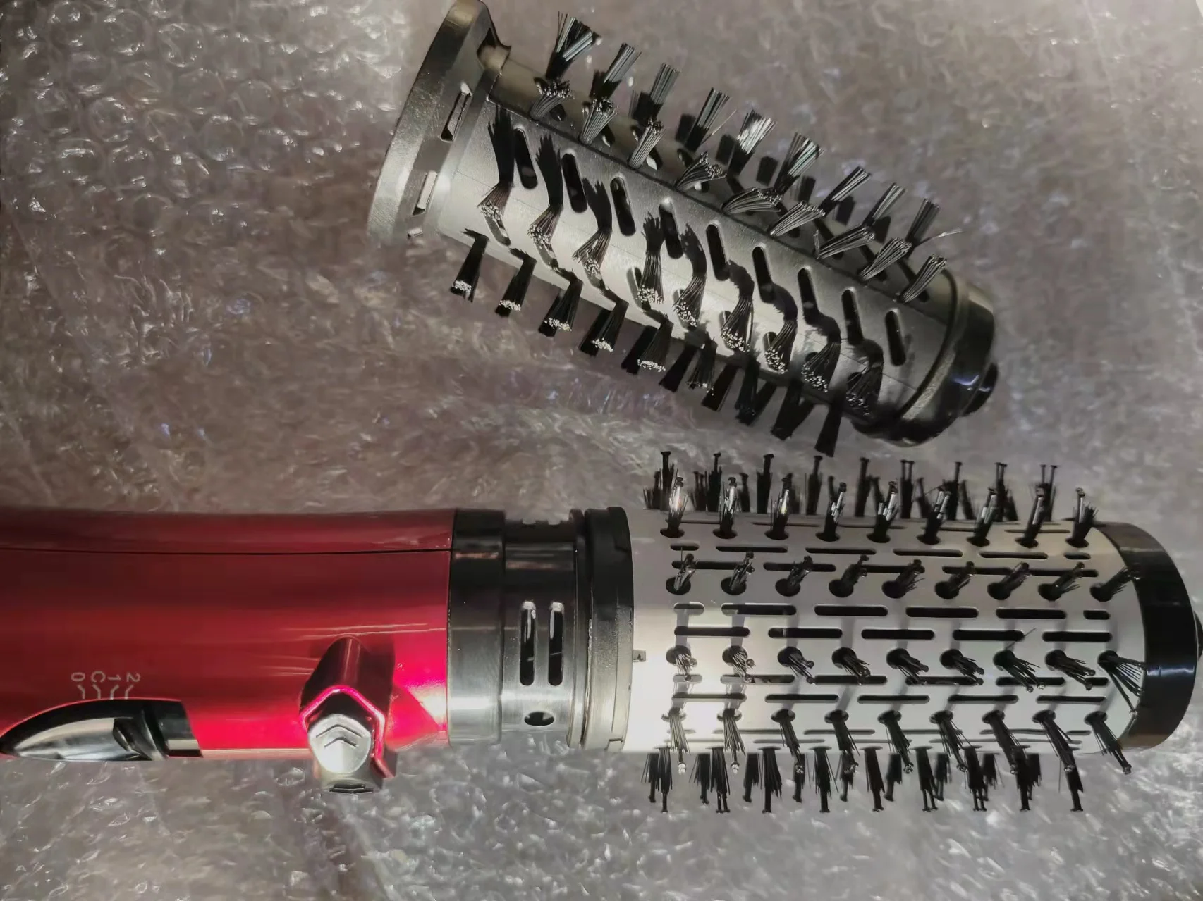 сделан вроде качественно, не хлипкий. при включении воняет, не знаю сколько продержится. насадка крутится не быстро. волосы не запутывает, не наматывает. нужно приловчиться, так как сам фен большой и не лёгкий. шнур у основания крутится, удобно.