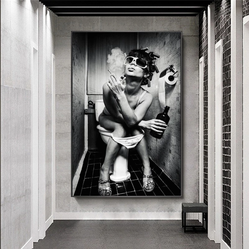 Привлекательная девушка, сидит в туалете, холст, фотография, черный и белый холст, фотография ванной