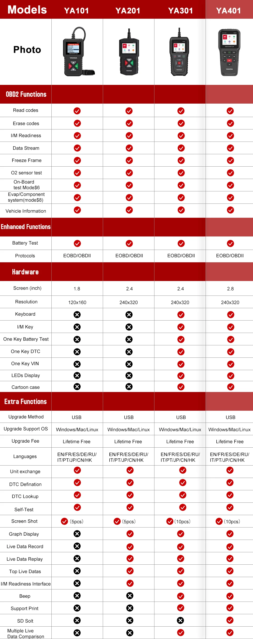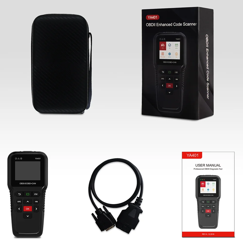 YA401 считыватель кодов автомобиля инструменту диагностики поставляется с большим 2,8 дюймов 320x240p четкое цветным дисплеем и 10 языков поддержка, что гарантирует удобство при носке запатентованная конструкция, больше OBD2 кабель, бесплатное обновление и многое другое enhenced функции.