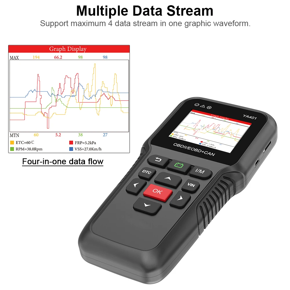 Сканер YA401 OBD2 обеспечивает максимальное отображение 4 живых данных одновременно для сравнения.