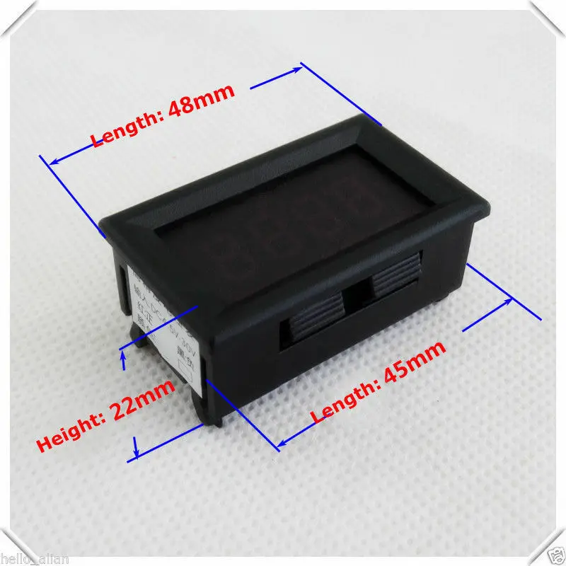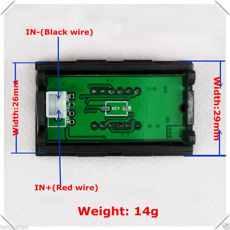 Вес:14 г Цвет дисплея:Красный/зеленый/синий Режим отображения: Четыре 0.36 светодиодный цифровых трубки Скорость обновления: Около 500 мс/раз Открытый размер:45*26 мм Физический размер: 48x29x22 мм (Д * Ш * В) Источник питания:Не нужен источник питания Длина провода: 14 см Диапазон измерения: 3,50-30,00 В постоянного тока Рабочая температура: -10 градусов ~ 65 градусов Точность измерения: ±(3 ‰ + 2 цифры)