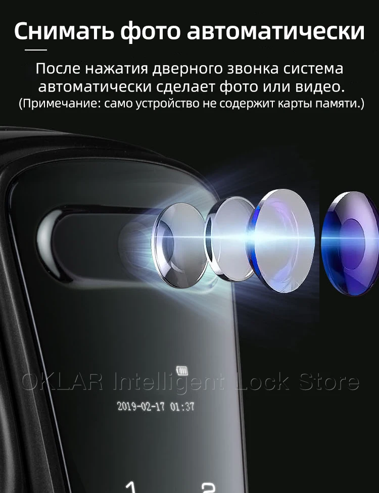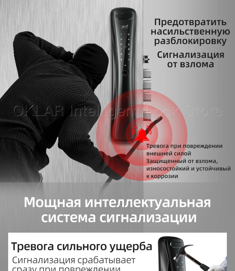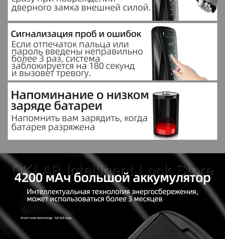 Делайте фотографии автоматически После нажатия на дверной звонок, система будет автоматически Делайте фотографии или видео Интеллигентая (ый) мониторинга Широкие перспективы Интеллигентая (ый) видео запись После того, как сети, вы можете посмотреть видео на вашем мобильного телефона Антивирусный пароль Защита конфиденциальности Финансовые профессиональные живые, определение отпечатка пальца Профессиональный биометрический сканер отпечатков технология идентификации, быстрая идентификация, 0,3 s быстрая разблокировка Пульт дистанционного управления со смарт-приложением Мощная и портативная Пароль удаленного доступа открывания двери Дверного проема напоминание Дверного проема запрос показателя Электричество может быть спросил Пучка ближнего света класса C безопасности цилиндр замка Лучшая открытия технологии, эффективное предотвращение производительность С защитой от вскрытия сигнализации Сигнал тревоги при повреждении внешней силой Нескользящая, устойчивая к износу и устойчивый к коррозии Мощный интеллигентая (ый) аварийная система Насильственный о повреждении отчета На аварийная система будут срабатывать сразу в тех случаях, когда дверной замок поврежден внешние силы Методом проб и ошибок сигнализации Если отпечатков пальцев или пароль ошибочно вход для более чем в 3 раза, система блокировки для 180s и триггер сигнал тревоги Напоминание о низком энергопотреблении При низком заряде батареи, устройство напомнит вам о необходимости зарядки 4200 ма аккумулятор большой емкости Интеллигентая (ый) Технология энергосбережения может использоваться в течение более чем 3 месяца Модернизированный батареи Скрытая замочной скважины Временная сила на интерфейсе Крытый фиксатор Независимый защелки, невозможно открыть на открытом воздухе Внутренний ключ зажигания Одна кнопка открывания/закрывания Двухрядные цифровых кнопок, сенсорный экран, вызванных люминесценции Анти-Электромагнитная катушка разблокировки