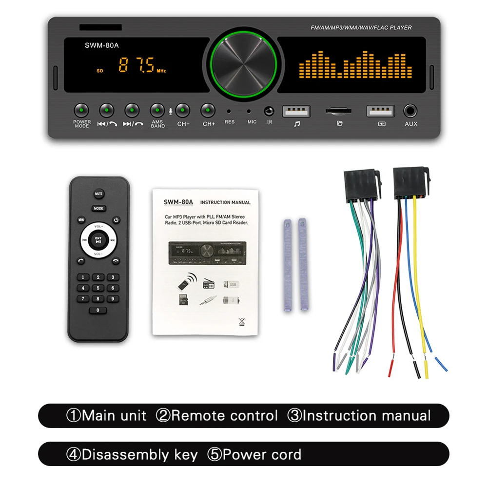 Автомобильный MP3-плеер SWM 80A 1 DIN с двумя дисплеями, USBFMTFAUX, стерео аудиоплеер, автомобильный локатор и искатель, головное устройство