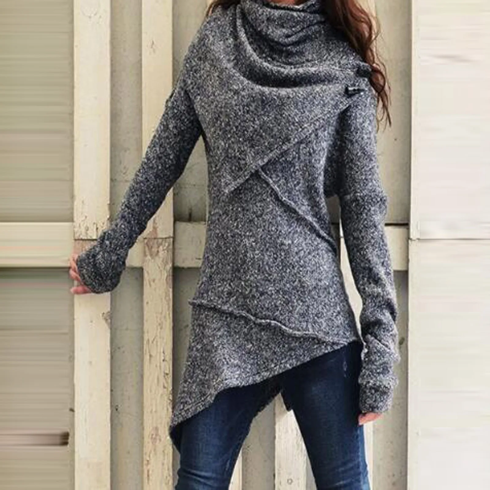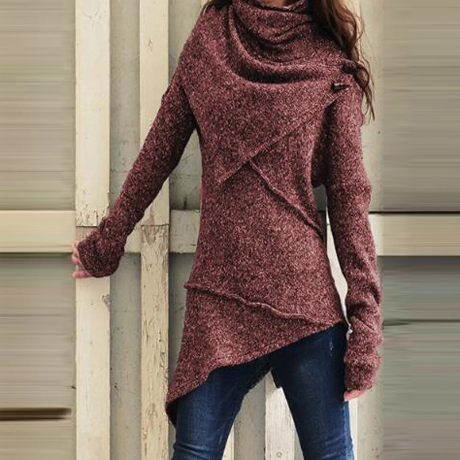 Женская мода Длинный рукав Высокий воротник чистый цвет Повседневный Элегантный пуловер Топы