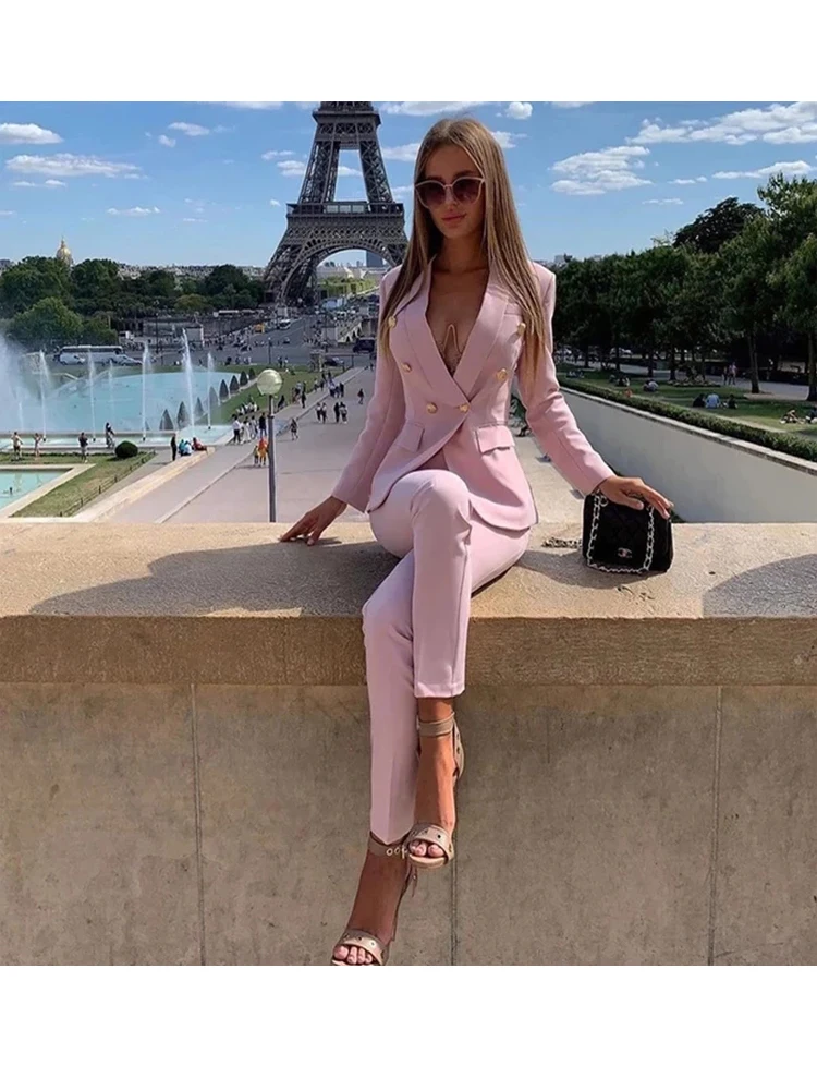 Прямая поставка, костюм из розовых и красных брюк, Женский деловой классический комплект из двух предметов, блейзер и брюки на пуговицах золотистого цвета