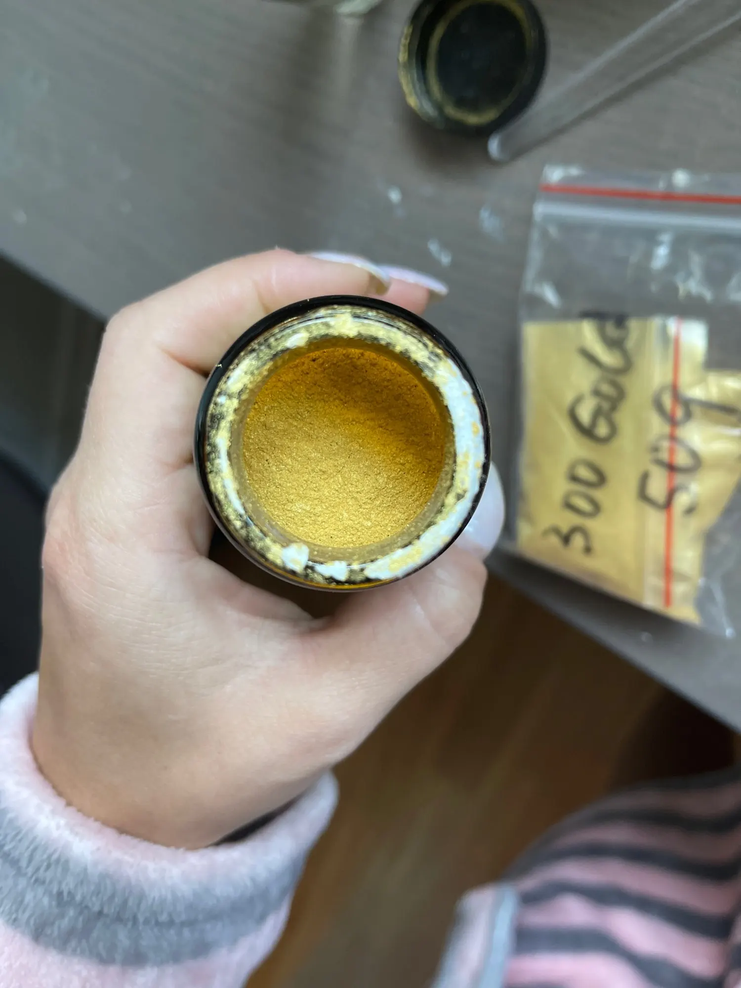 Хотелось бы больше золотого блеска а так светлый перламутровый порошок, доставка быстрая, упаковано отлично. Спасибо.