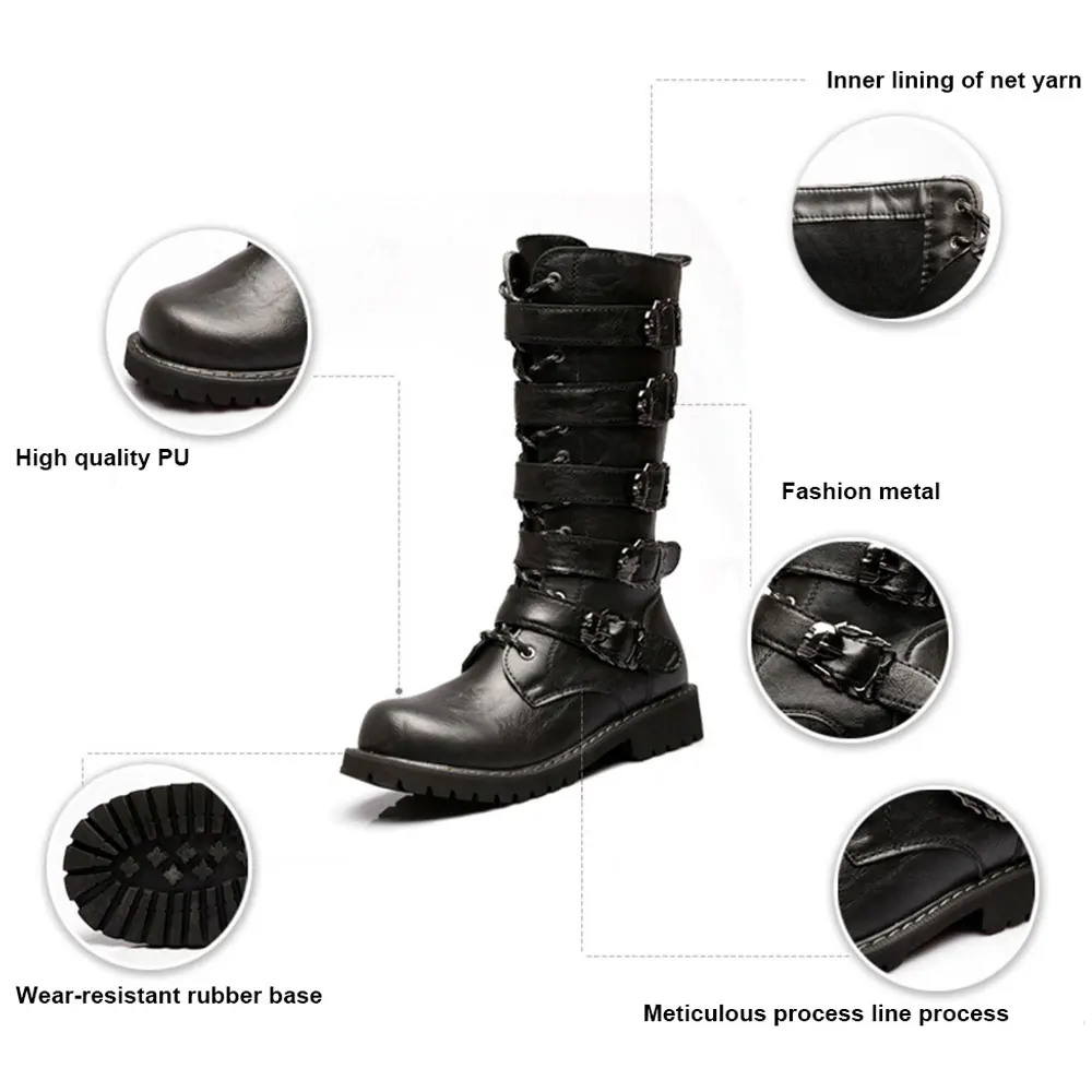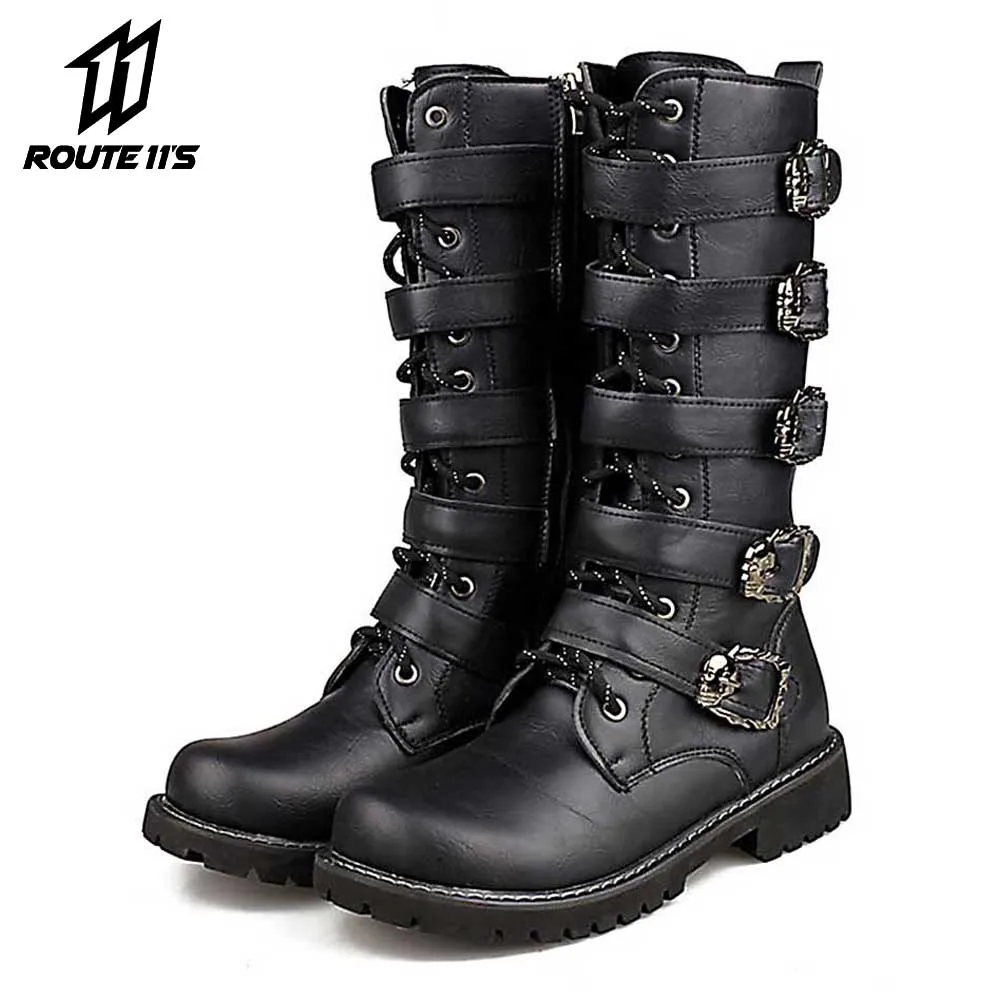 Мотоциклетные ботинки; Мужские мотоботы из искусственной кожи; Мотоботы в стиле рок; Мотоботы до середины икры с пряжкой; Черные Ботинки Martin в стиле панк