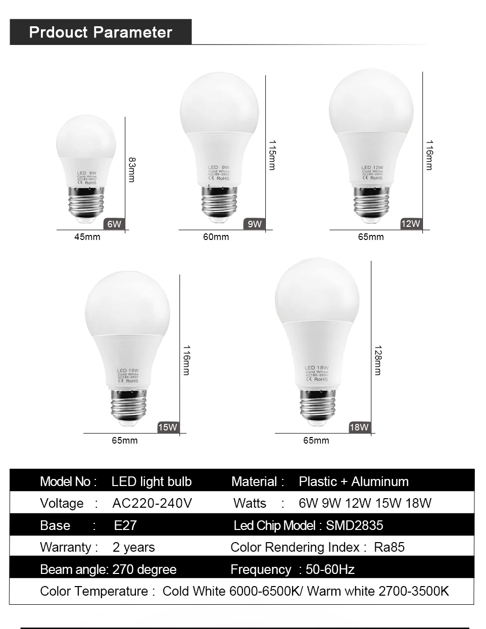 Светодиодные настольные лампочки E27, точечные LED светильники холодного и теплого белого света, 3 Вт, 6 Вт, 9 Вт, 12 Вт, 15 Вт, 18 Вт, 220 В, 230 В, 240 В переменного тока