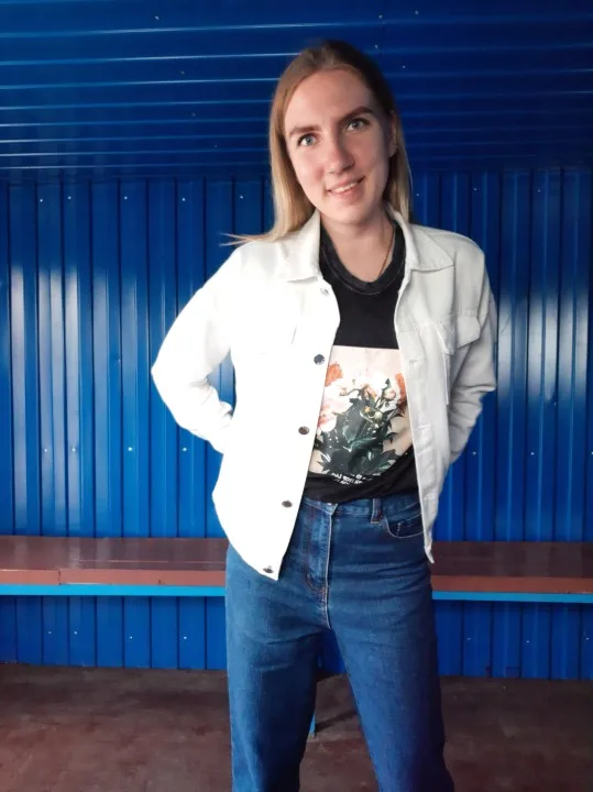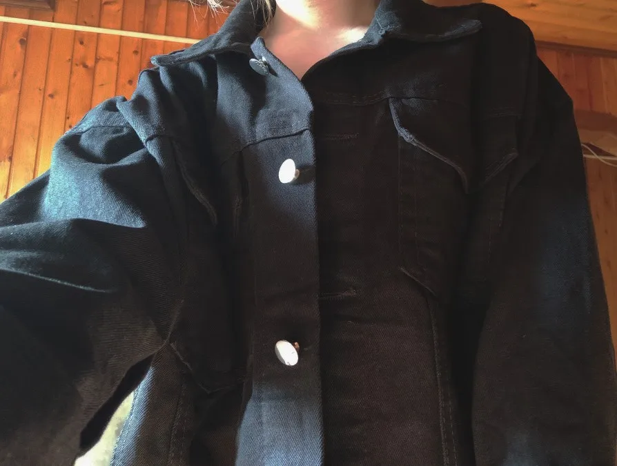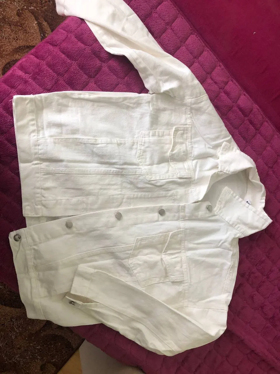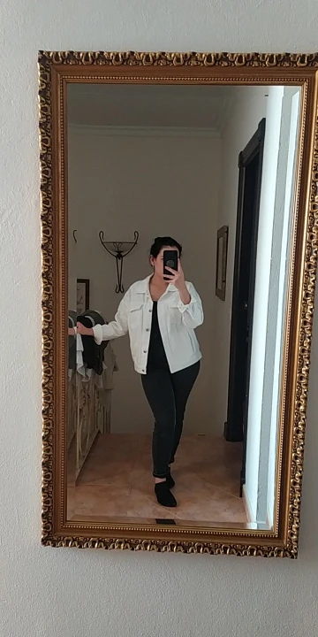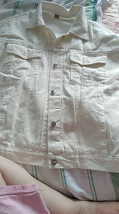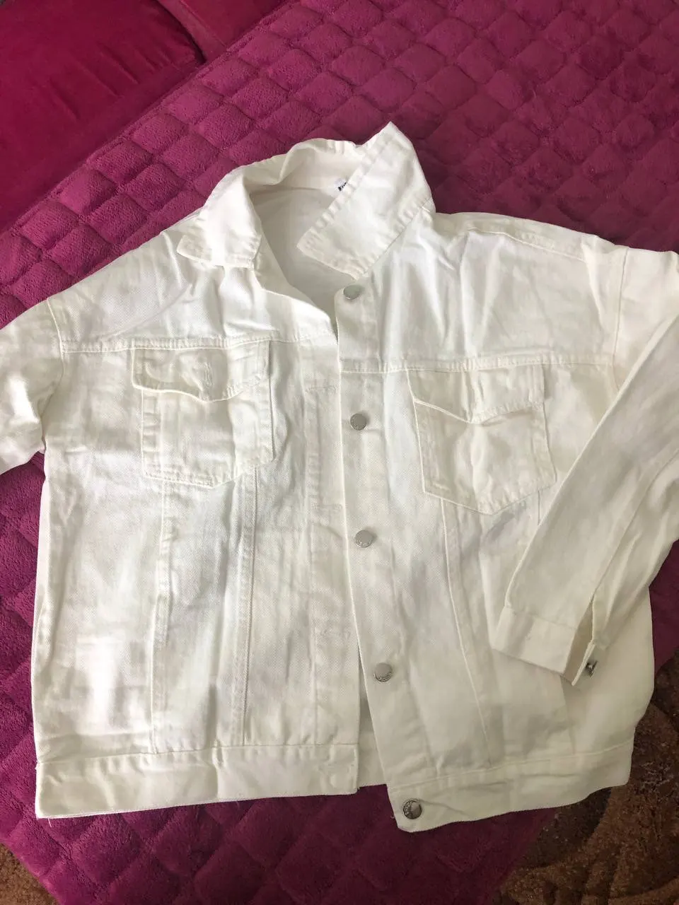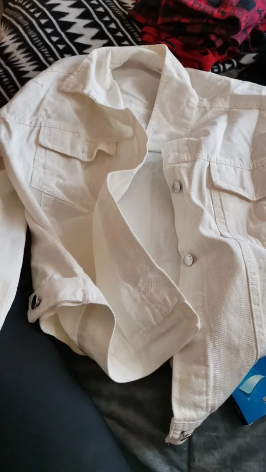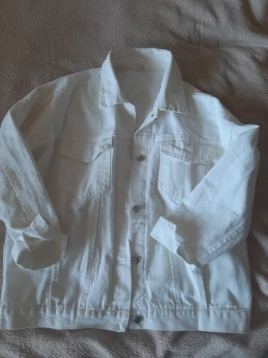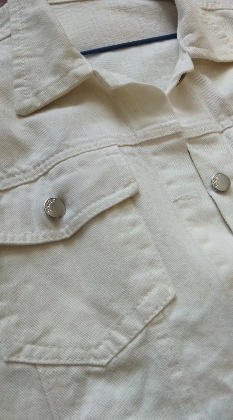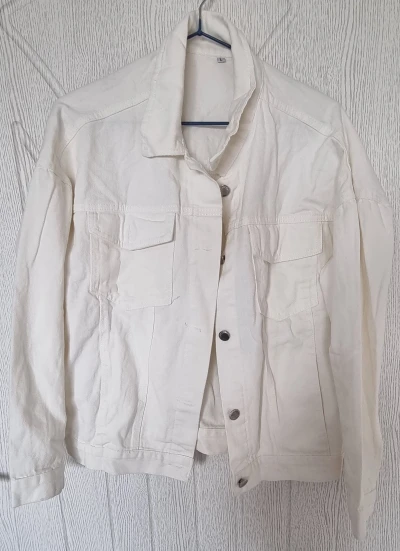 Куртка классная, ткань не очень плотная, не джинса, скорее джинсовая ткань, цвет не белый, а молочный. Сшито все ровно, но торчат нитки в местах для просовывания пуговиц. Заклёпки выглядят немного хлипко. Заказала на свой 46 - L село идеально, так что при заказе не берите размер в размер.