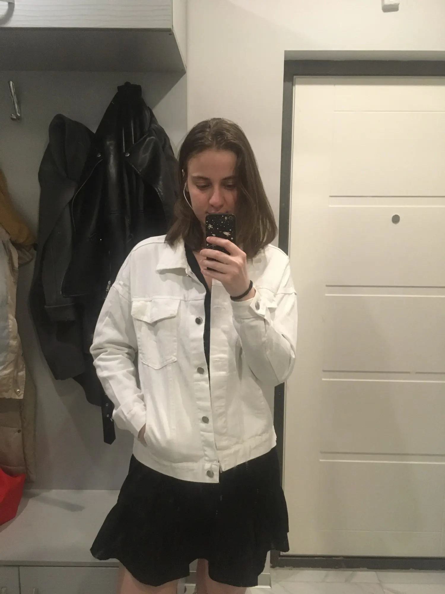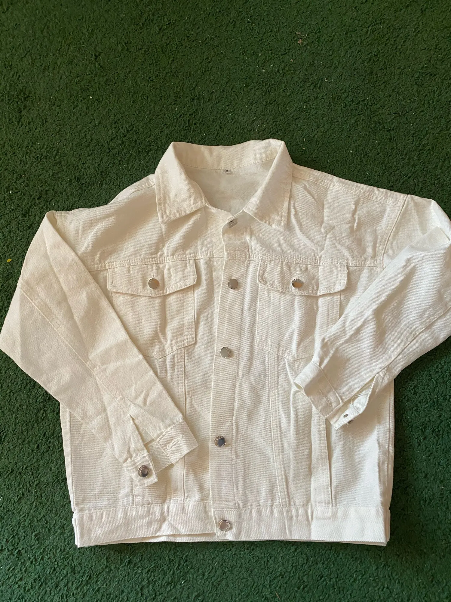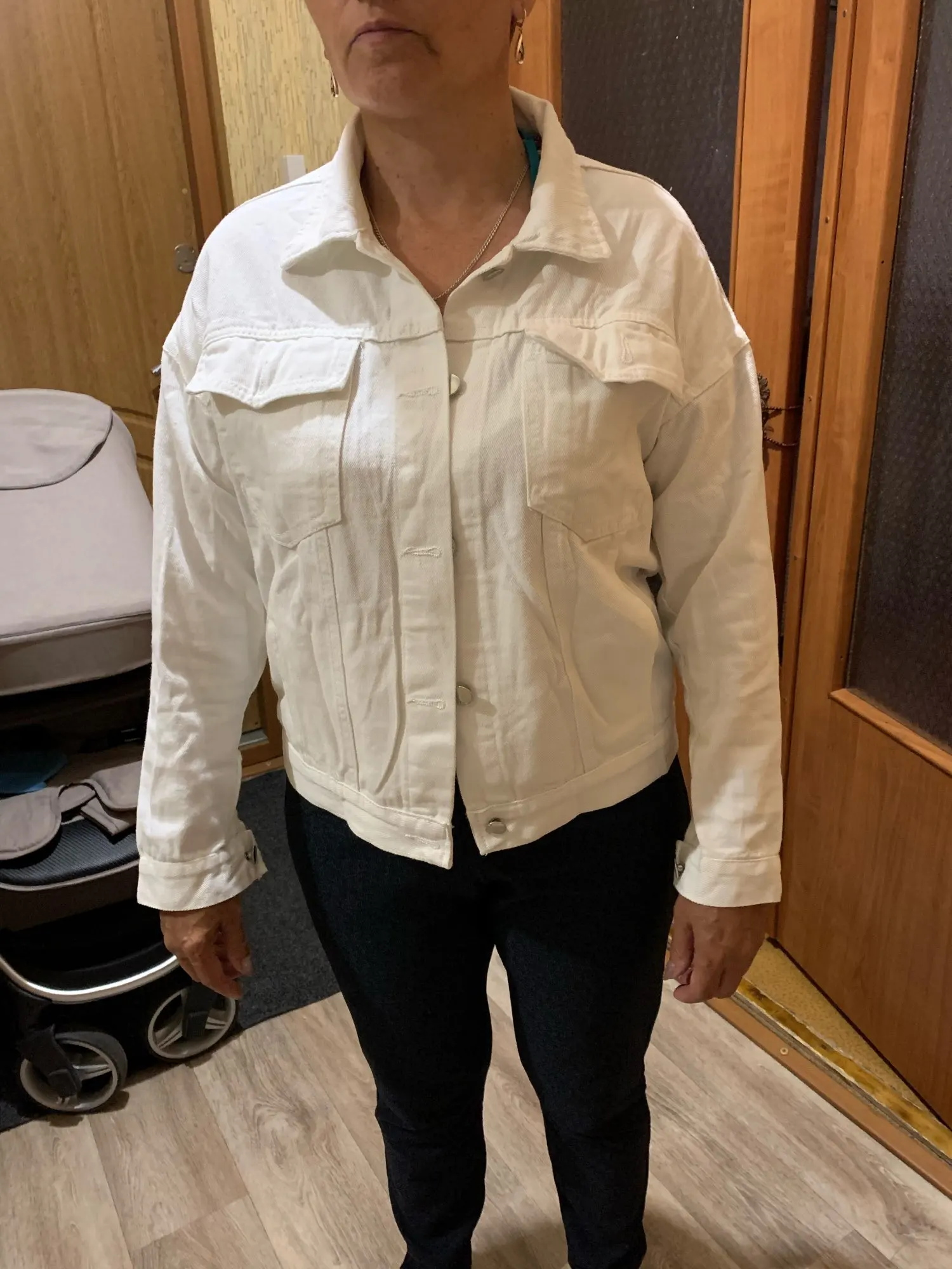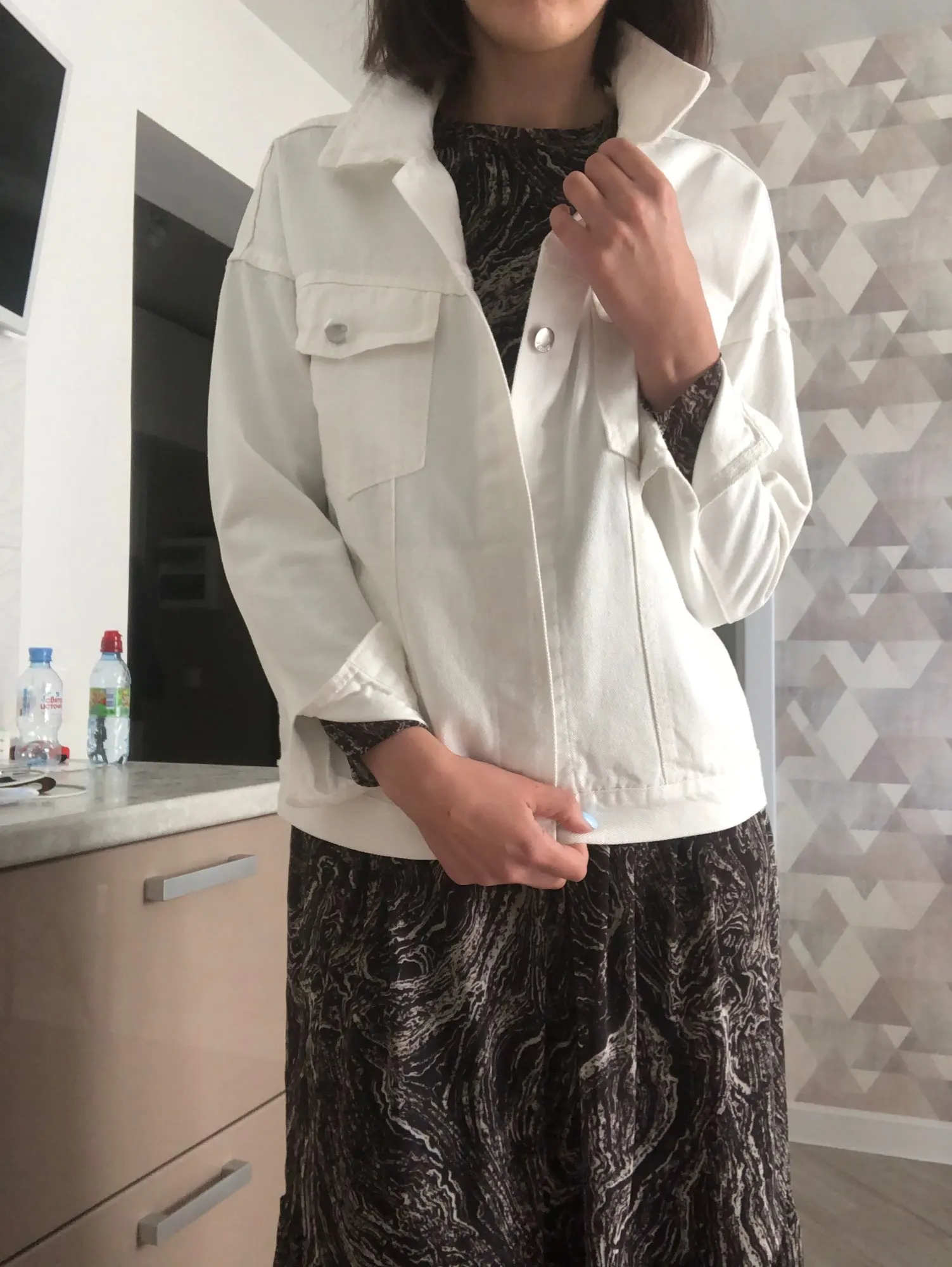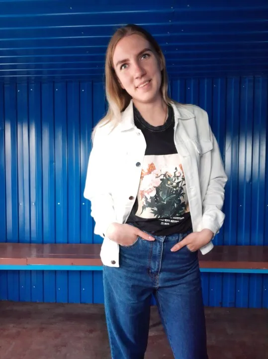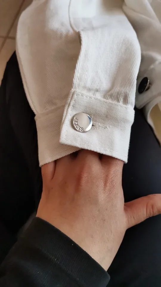 Куртка классная, ткань не очень плотная, не джинса, скорее джинсовая ткань, цвет не белый, а молочный. Сшито все ровно, но торчат нитки в местах для просовывания пуговиц. Заклёпки выглядят немного хлипко. Заказала на свой 46 - L село идеально, так что при заказе не берите размер в размер.