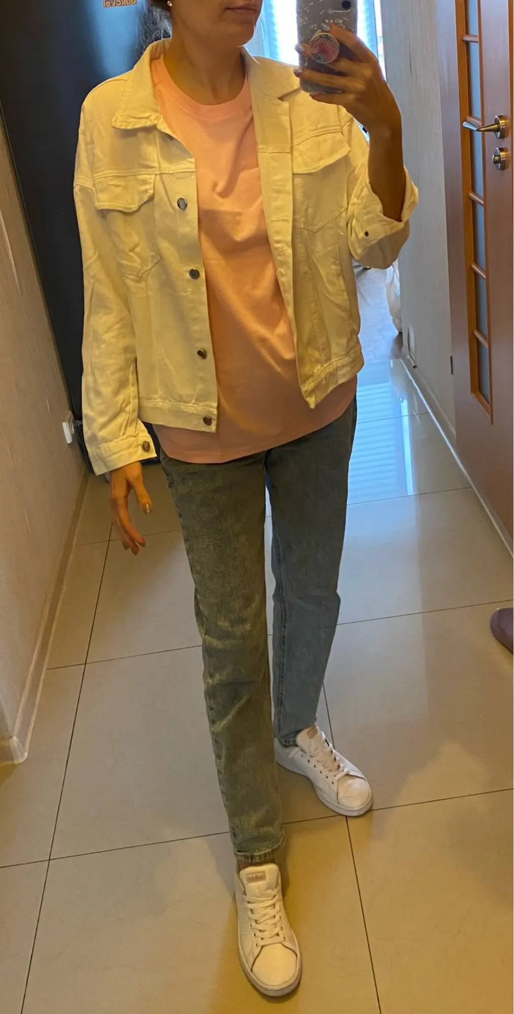 отличная плотная джинсовка, цвет ближе к молочному. оверсайз не впритык, размер соответствует. на свой 42 взяла s и все равно нормальный такой оверсайз ) по времени около 3 недель шла, продавец сразу выходит на контакт при возникающих вопросах