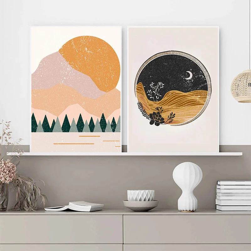 Абстрактный пейзаж солнце и луна пейзаж в стиле бохо Холст принты к...