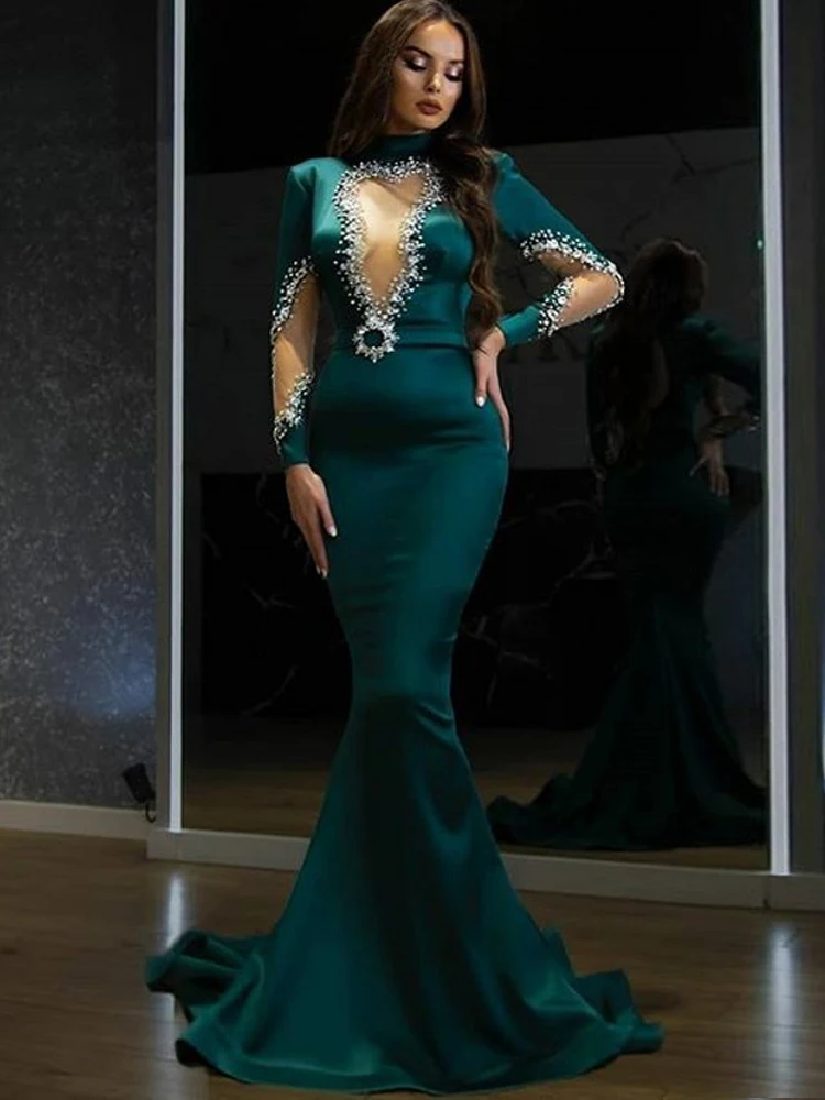Арабское вечернее платье LORIE, 2021, зеленое атласное платье с высоким воротом и длинными рукавами, украшенное бисером, для вечеринок, платье-Русалка для выпускного