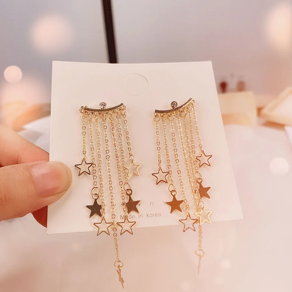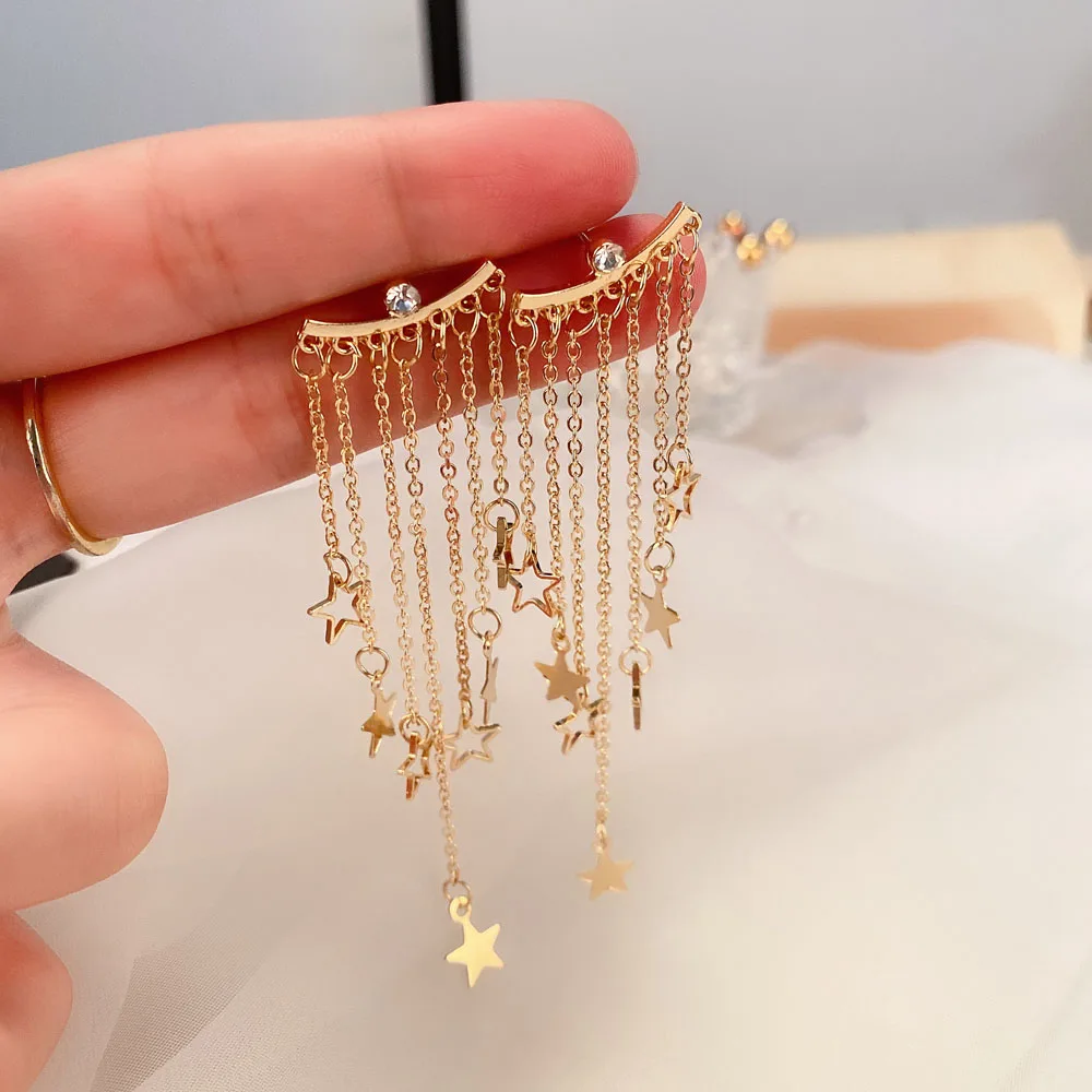 Женские серьги-подвески, с блестящими кристаллами, на длинной металлической цепочке, с кисточками, звездочками, ювелирные украшения вечерние, задняя подвеска