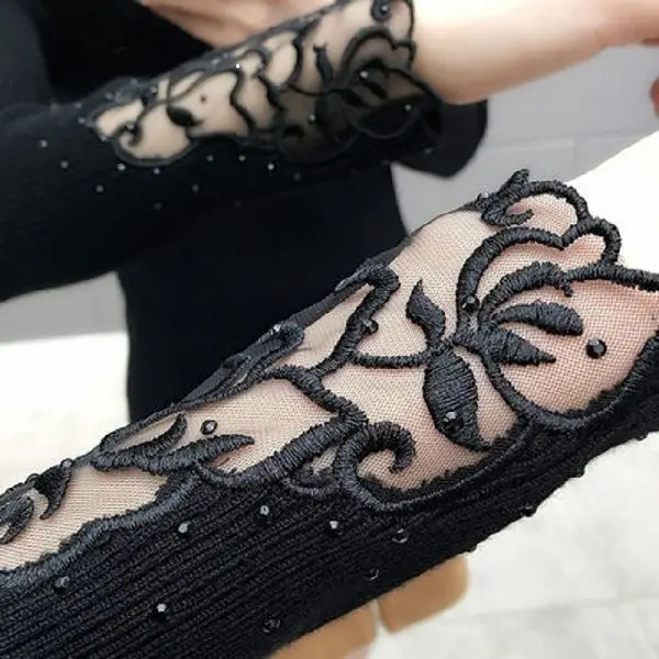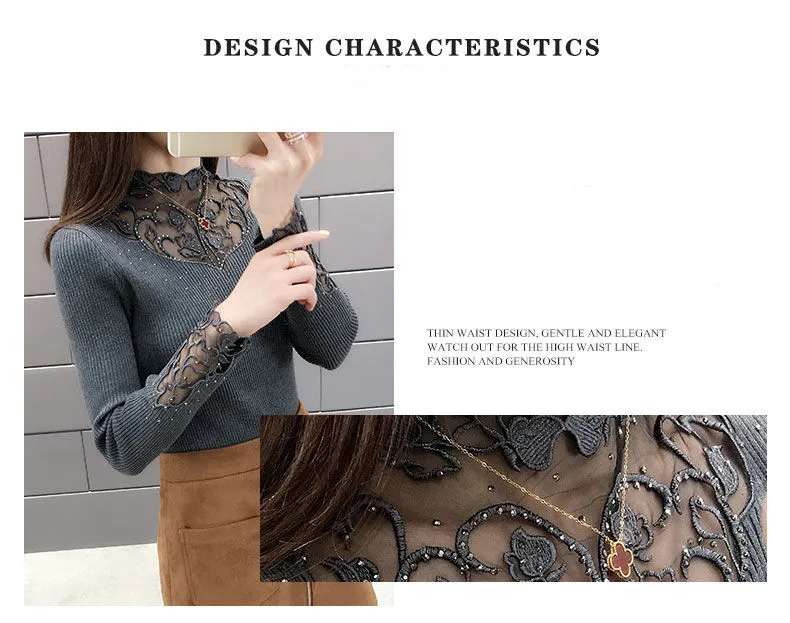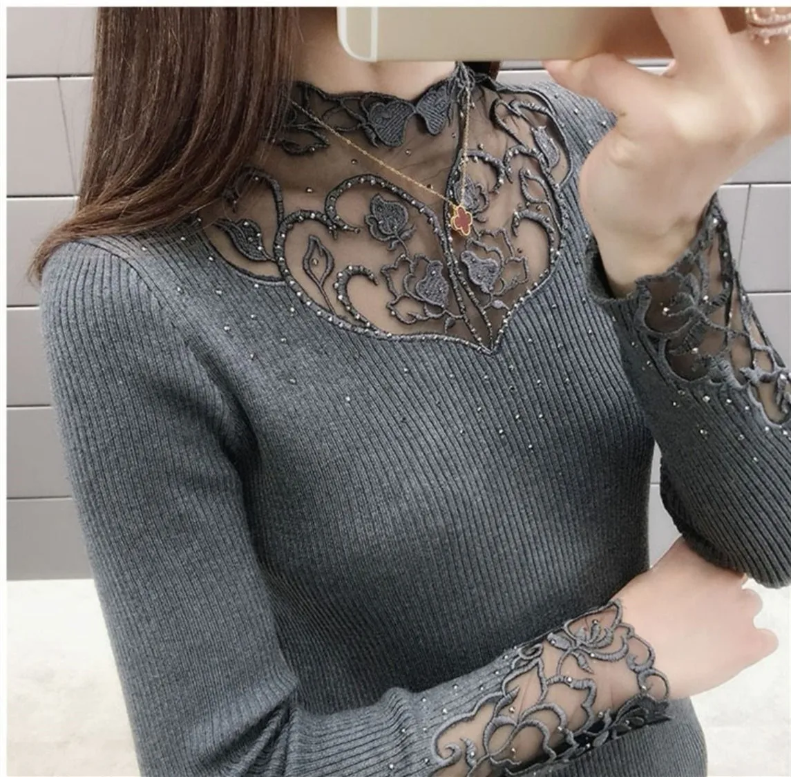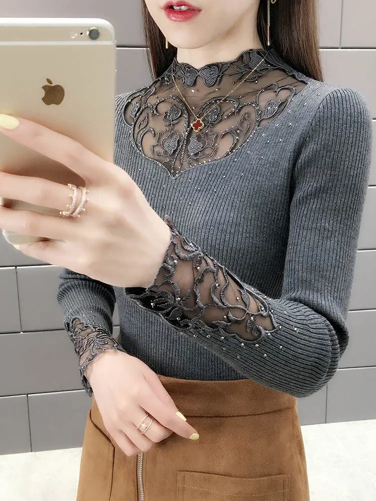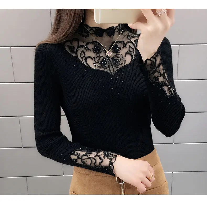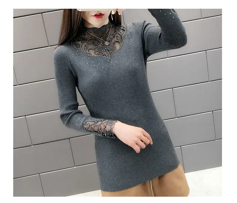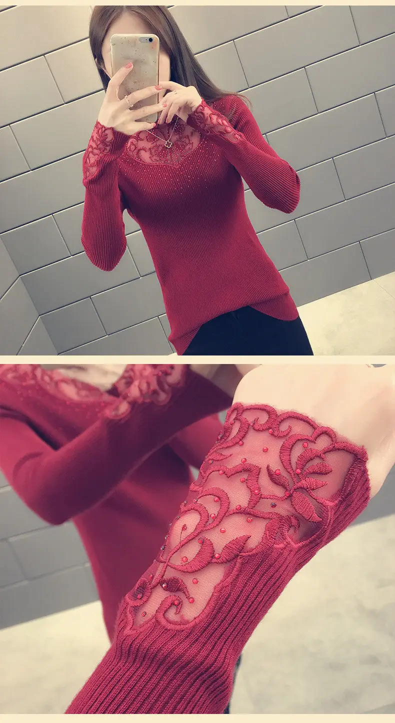 Пуловер женский трикотажный, с кружевным воротником и длинным рукавом