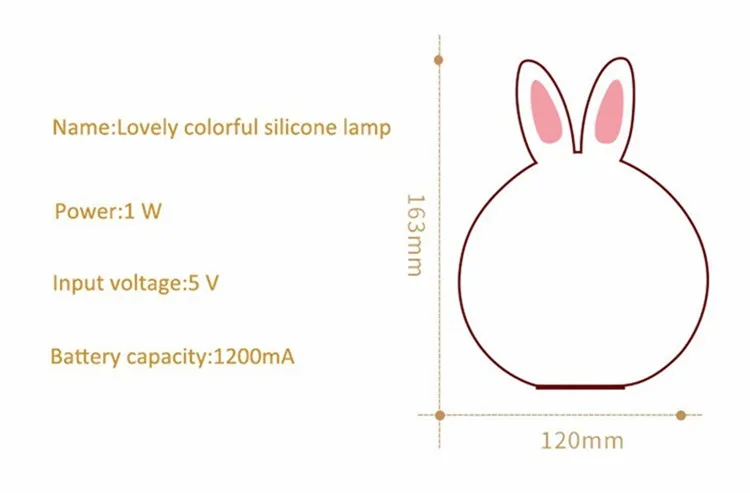 Этот милый ночной Светильник дает красочные светильник. У вас будет замечательная ночь с компанией этой лампы. Это не только прекрасное украшение для вашей комнаты, но и идеальный подарок для ваших семей и друзей. Основные характеристики: Пожалуйста, нажмите на сенсорный выключатель в нижней части лампы, теплый белый светильник в это время, указав, что мощность была открыта, первый pat красный светильник, второй pat-это зеленый светильник, третий pat-синий светильник, четвертый pat-яркий светильник, пятое pat-выключить светильник, Когда вы злитесь, просто погладьте его, и он даст вам светильник цвета радуги Милый дизайн кролика, он выглядит красиво, куда бы вы его ни положили Силикон + АБС-пластик, экологически чистый и прочный в использовании Небольшой размер и легкий, легко носить с собой Идеально подходит для спальни, гостиной, прикроватной кровати, офиса и т. д. Питание осуществляется любыми устройствами с usb-портом, такими как ваш компьютер, рабочий стол, ноутбук, внешний аккумулятор Встроенный литий-ионный аккумулятор 1200 мАч Время работы: около 10 часов в режиме теплый белый светильник, около 8 Часы в режиме изменения цвета Время зарядки: около 3 ч Напряжение: 5 В Мощность: 0,4 W Тип батареи: литий-ионный