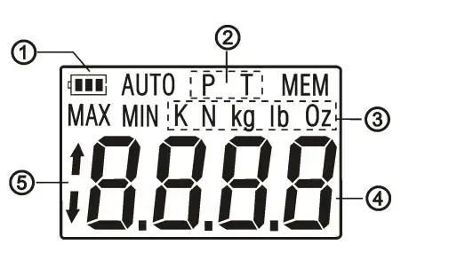Дисплей1. Мощность аккумулятора.2. Экран одновременно отображает «P» и «T» в качестве первого пикового режима, что указывает на то, что первое пиковое значение, измеренное в течение определенного периода времени, записано; экран отображает один «P» в качестве пикового режима, показывая, что измеренный период времени записывается максимальное значение силы; Нажмите « Пиковая клавиша для свободного переключения между пиковым и первым пиковым режимами.3. Дисплей блока.4. Отображение значения силы измерения.5. Сила нажима: верхняя стрелка показывает силу тяги, а нижняя стрелка показывает силу нажатия.