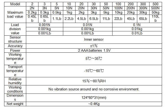 Информация о продуктеЦифровой дисплей push-pull force meter-это небольшой, простой, многофункциональный и Высокоточный испытательный инструмент, который широко используется в электронных приборах, строительной технике, светильник, Промышленный Текстиль, автозапчасти, светильник ers и другие устройства зажигания, пожарное оборудование, ручка, производящая нажимную нагрузку, Испытание силы вставки, Разрушительное испытание замков, рыболовных снастей, химической промышленности, силового оборудования, научно-исследовательских учреждений и других отраслей промышленности.Цифровой дисплей имеет высокое разрешение, быструю скорость выборки и прост в использовании. Это новое поколение с высокой пропускной способностью и высокой точности двухтактный контрольно-измерительный прибор.Характеристики1. Высокая точность и высокое разрешение.2. Три режима измерения для выбора (в режиме реального времени, пик, Первый пик.3.N (Ньютон), кг (килограмм), фунты (фунт) и унции (унция) четыре единицы для выбора и преобразования.4. Функция настройки гравитационного ускорения ---- пользователь может вводить по вашему выбору точное значение гравитацииУскорение на месте использования, чтобы сделать тестирование и преобразование единиц быть более точным.5. Верхний и нижний лимиты могут быть установлены для анализа статистики. Звуковой сигнал будет оповещаться при превышении лимита.6. Функция защиты минимального значения силы: данные в пределах установленного минимального диапазона могут быть экранированы;7. Функция автоматического отключения: время автоматического отключения может быть установлено, и автоматическое выключение может достичь эффекта экономии точки, когда нет работы в течение длительного времени.8. Мощность: 2 шт. AAA батареи (1,5 V * 2) (не прилагаются)9. Автоматическая подсветка, функция будильника;