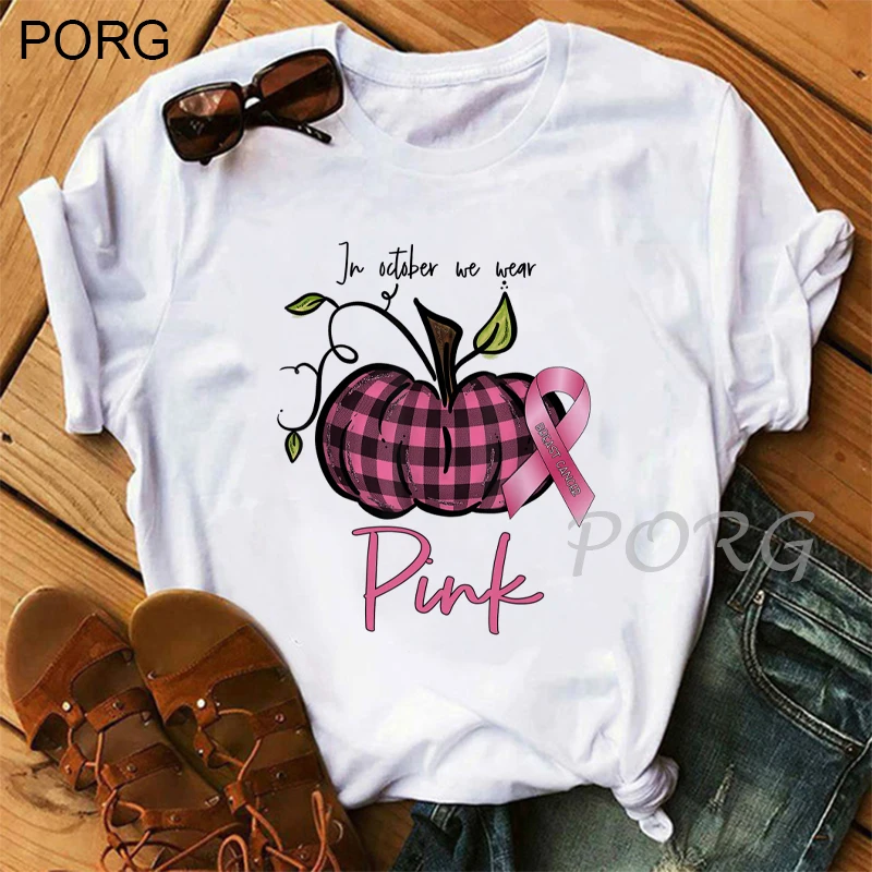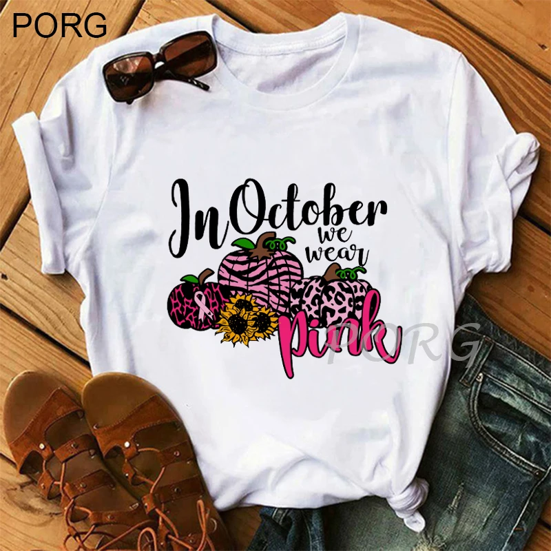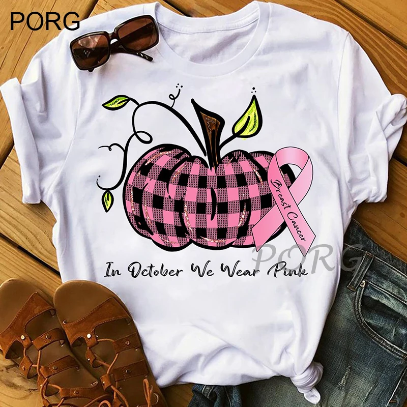 В октябре мы Носите осеннюю футболку с изображением розовой ленты и рака груди с тыквой, Женская Винтажная Футболка 2020 розового цвета, женский топ в эстетике