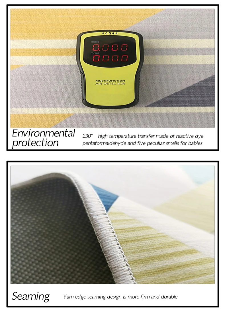 1. Ковровая ткань: ковер изготовлен из трех слоев ткани, напечатанный и окрашенный короткий ворсовый поверхностный слой, Нетканая ткань в среднем слое, нижний слой полностью прилегает к нескользящей подошве.2. Толщина ковра: дизайн трехслойной ткани делает наши ковры толще, чем другие ковры, мягкие и нескользящие, длительный срок службы, и не легко деформируется.3. Ковер не имеет специфического запаха: 0 формальдегид, безопасный и без специфического запаха, мягкая ткань ковра используется для детей, чтобы играть на ковре.4. Легко ухаживать: короткий ворс делает наши ковры легко ухаживать, и пыль не легко застревать на ворсе. Его нужно только регулярно пылесосить или очистить.5. Качество ковров: наши ковры имеют лучшее качество, чем обычные ковры, с толстой толщины, хорошая ткань, мягкая и приятная для кожи, легко ухаживать, нулевой формальдегид, нет специфического запаха, никакого вреда для человеческого тела, и ковры высокого качества имеют более длительный срок службы!