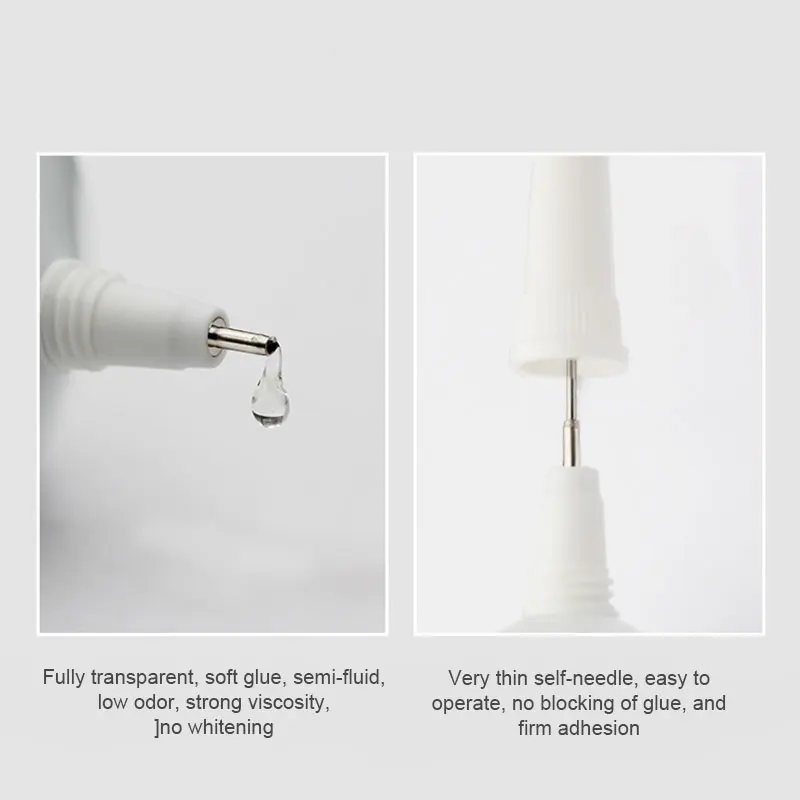 Особенность: 1. С помощью игольчатой конструкции, которую можно открыть после использования, она не заткнется. Допускает мелкие капли клея для тонкой, точной, контролируемой и без беспорядка. 2. Многоцелевой, способный постоянно соединять различные материалы. Подходит для смартфонов, ювелирных изделий, электронных компонентов, игрушек, металла, стекла, резины, волокна, бумаги, керамики, дерева, ткани, текстиля, нейлона, ПВХ, кожи и других материалов. 3. Ударопрочность: очень высокая эластичность, можно растянуть до собственной длины 900%, не порвется, эффективно связывается с расширением материала с поверхностью, повышает долговечность несущей конструкции. 4. Герметичные свойства: герметичный и изолированный газ, жидкость, поток воздуха, в подводной среде с пластиком на длительный срок для поддержания превосходной прочности склеивания.