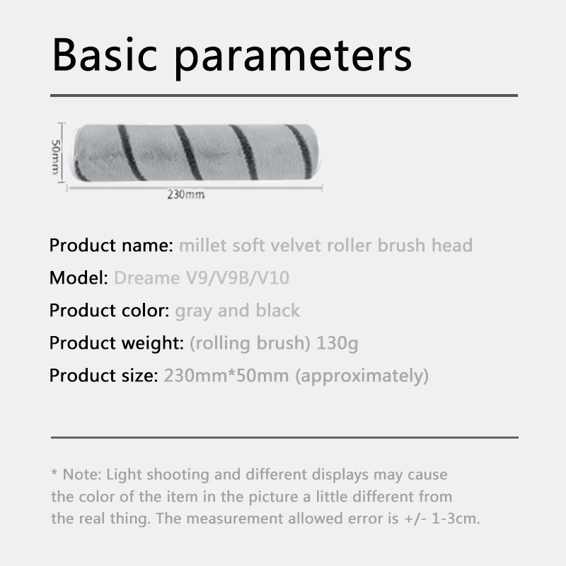 Название продукта: мягкая бархатная роликовая щеткаМодель: Dreame V9/V9B/V10Цвет изделия: серый и черныйВес изделия: (прокатная щетка) 130 гРазмер изделия: 230 мм * 50 мм (приблизительно)* Примечание: светильник и различные дисплеи могут привести к тому, что цвет товара на картинке немного отличается от реального. Допускается погрешность в измерениях +/- 1-3 см.