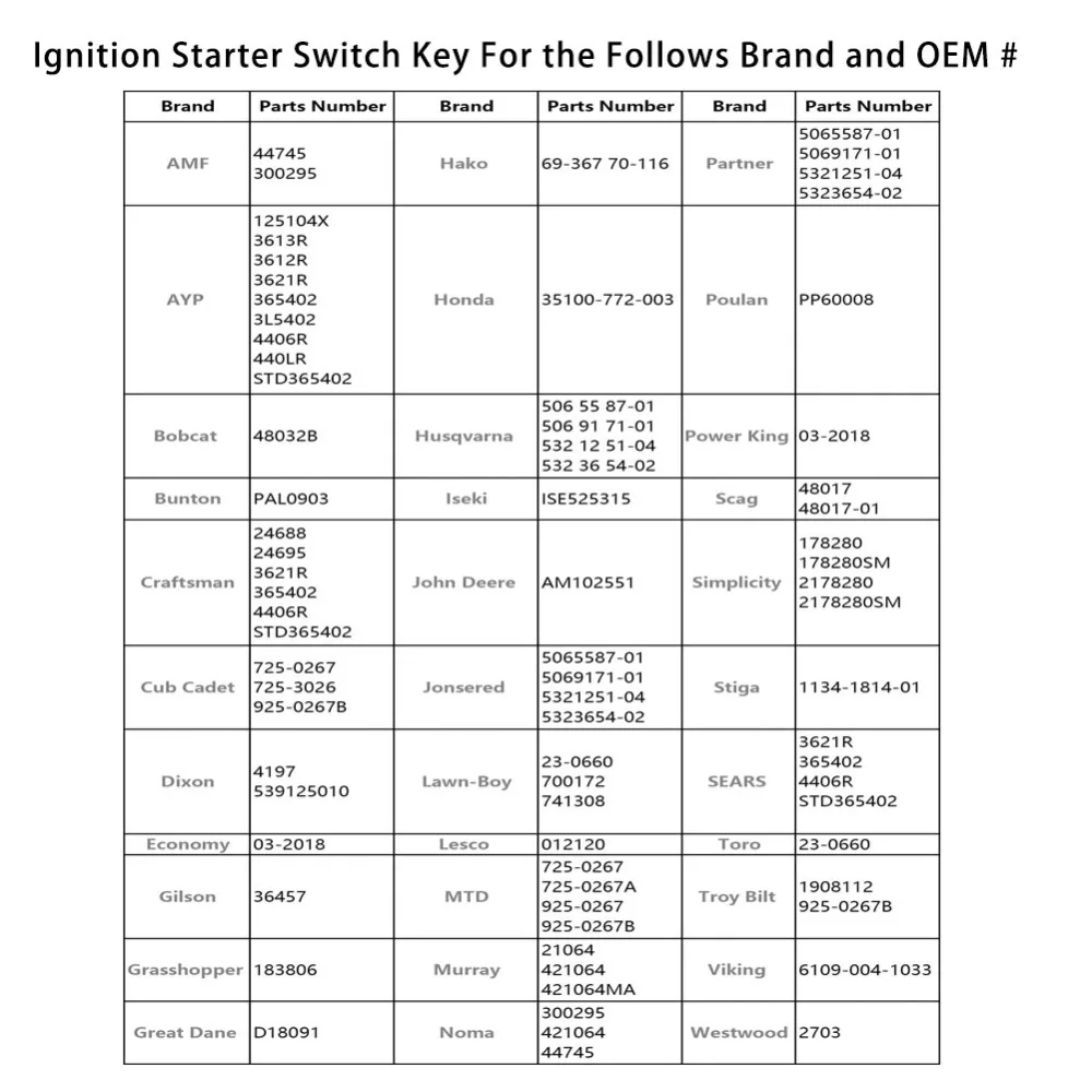 Стартовый ключ зажигания для AMF,AYP,Bob Cat,Bulton,Craftsman,Cub Cadet,Dixon,Economy,Gilson,Grasshopper,Great Dane,Hako,Honda,Husqvarna,Iseki, john Deere,Jonsered,Lawn Boy,Lesco,Murray,Noma,PartnerНиже представлены:АМФ44745300295AYP125104X3613R3612R3621R3654023L54024406R440LRSTD365402Bobcat48032BБАНТОНPAL0903Мастер24688246953621R3654024406RSTD365402Cub Cadet725-0267725-3026925-0267BДиксон4197539125010Пособия по экономике03-2018Gilson36457Кузнечик183806Грейт ДанеD18091Хако69-367 70-116Honda35100-772-003Husqvarna506 55 87-01506 91 71-01532 12 51-04532 36 54-02IsekiISE525315John DeereAM102551AM34872Jonsered5065587-015069171-015321251-045323654-02Газон-мальчик23-0660700172741308Lesco012120Мюррей21064421064421064MAНома30029542106444745Партнер5065587-015069171-015321251-045323654-02Посылка: 1 стартовый переключатель зажигания, 2 ключа, 1 сервисная карта