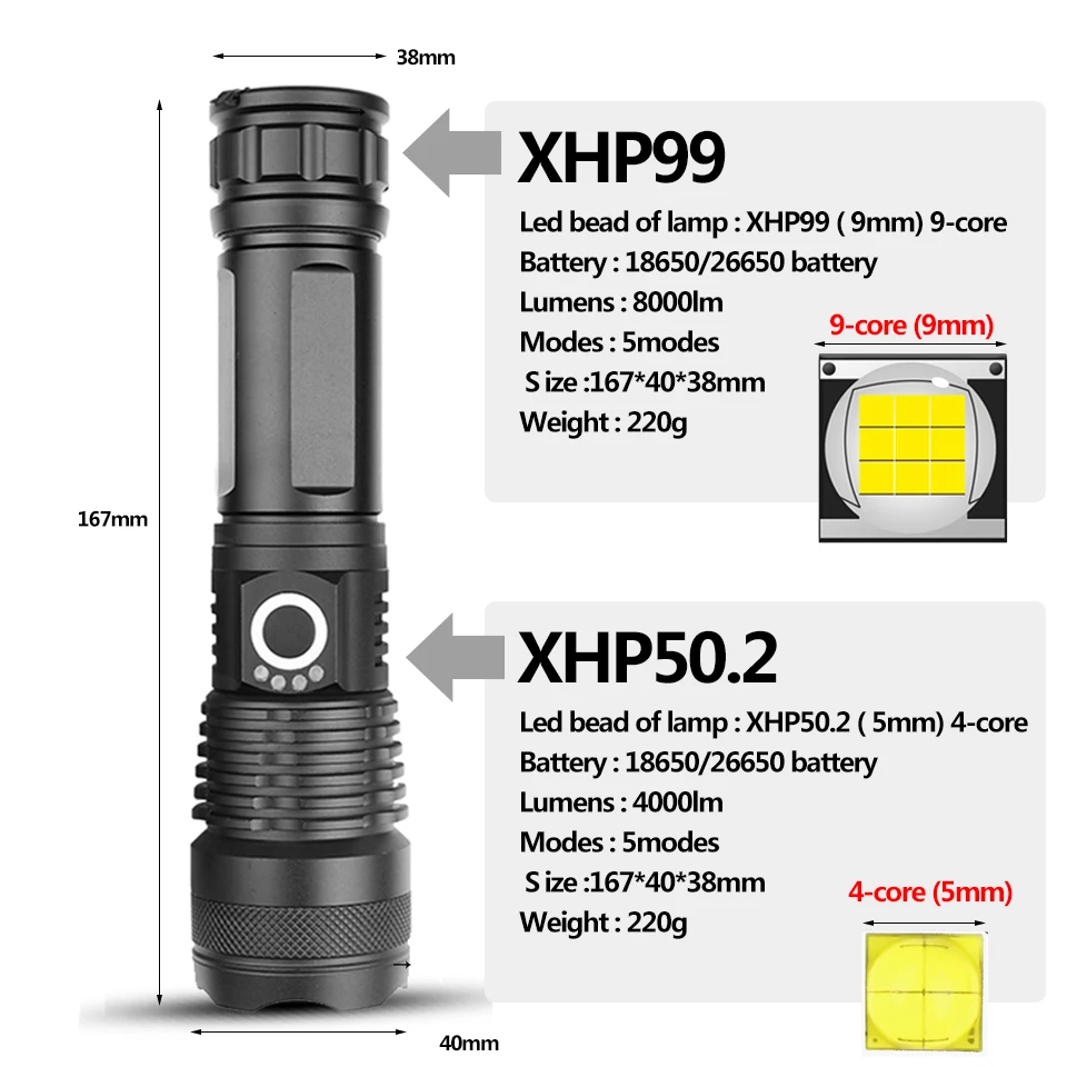 Мощный светодиодный фонарь Xhp99, алюминиевый водонепроницаемый фонарь с 9-ядерным процессором, зарядкой от Usb, фокусировкой 18650 и 26650, фонарь XHP50.2