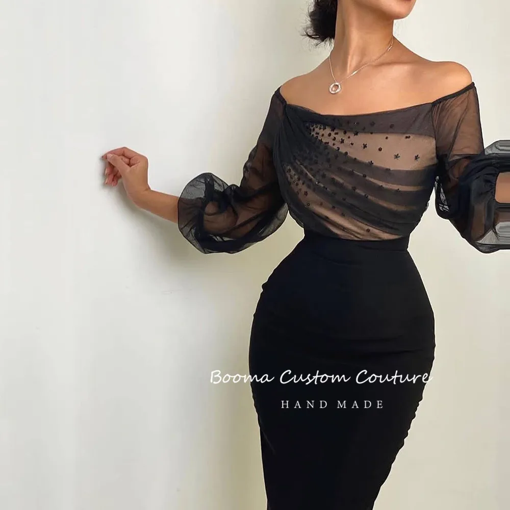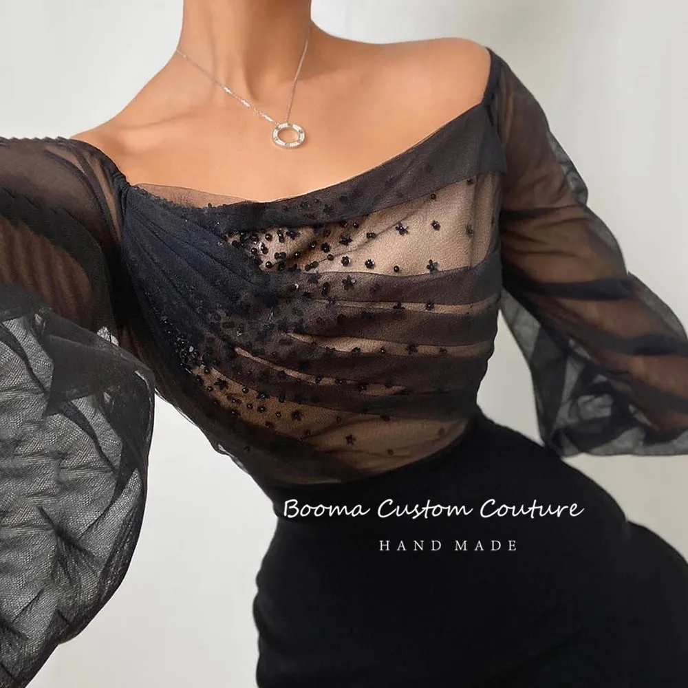 Черные платья с открытыми плечами для выпускного вечера, с длинным рукавом, с рюшами, с бисером, облегающие платья для свадебной вечеринки