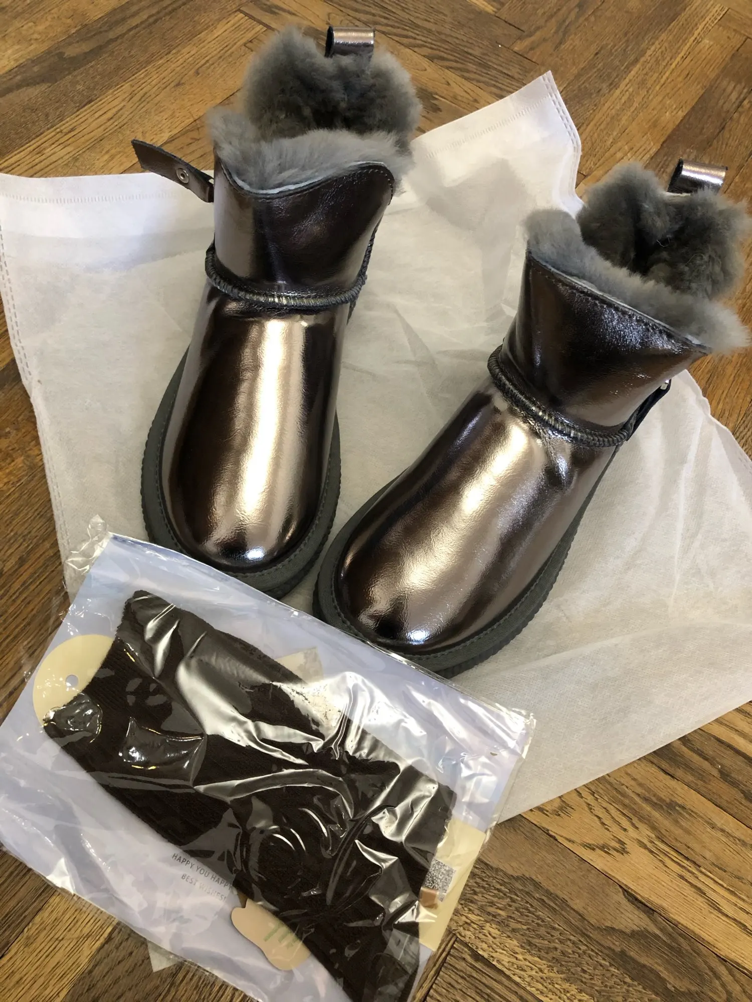 Шикарные уги и стоят своих денег. Заказала 27 декабря, сегодня пришли (две недели). Доставили в дутом пакете, мешок и вставки внутри - форма идеально и нигде нет заломов. Носочки в подарок. У меня 23,5 (37 европейский), мне как раз на тонкий носок, мех примется при носке и будет ОК, не люблю когда потом болтаются. Очень тёплые, сегодня обработала спец спреем (удивляюсь отзывам, что не кожа, пошли пятнами и тд.. любую кожу надо обрабатывать, после сильного дождя/снега повторно и обуви сносу не будет).
