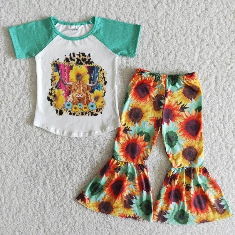 Оптовая продажа, Детская рубашка с коротким рукавом и оборками, топ, штаны с колокольчиком, осенняя бутиковая детская одежда для девочек, модные комплекты