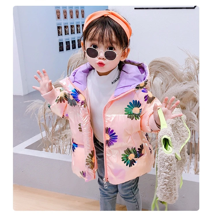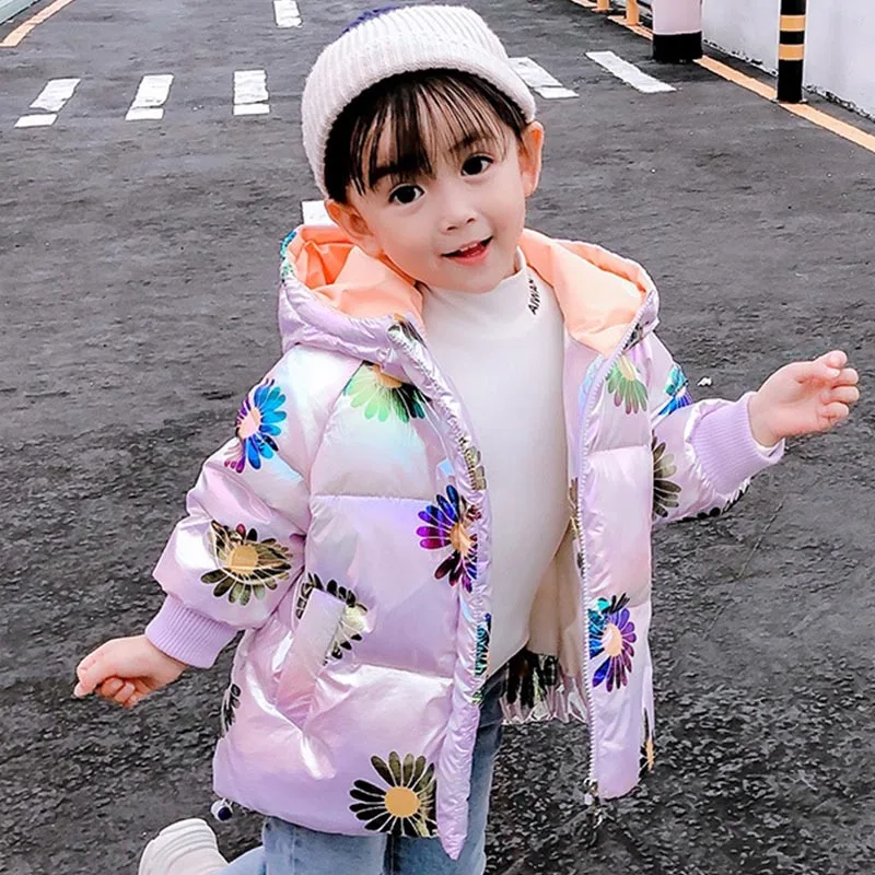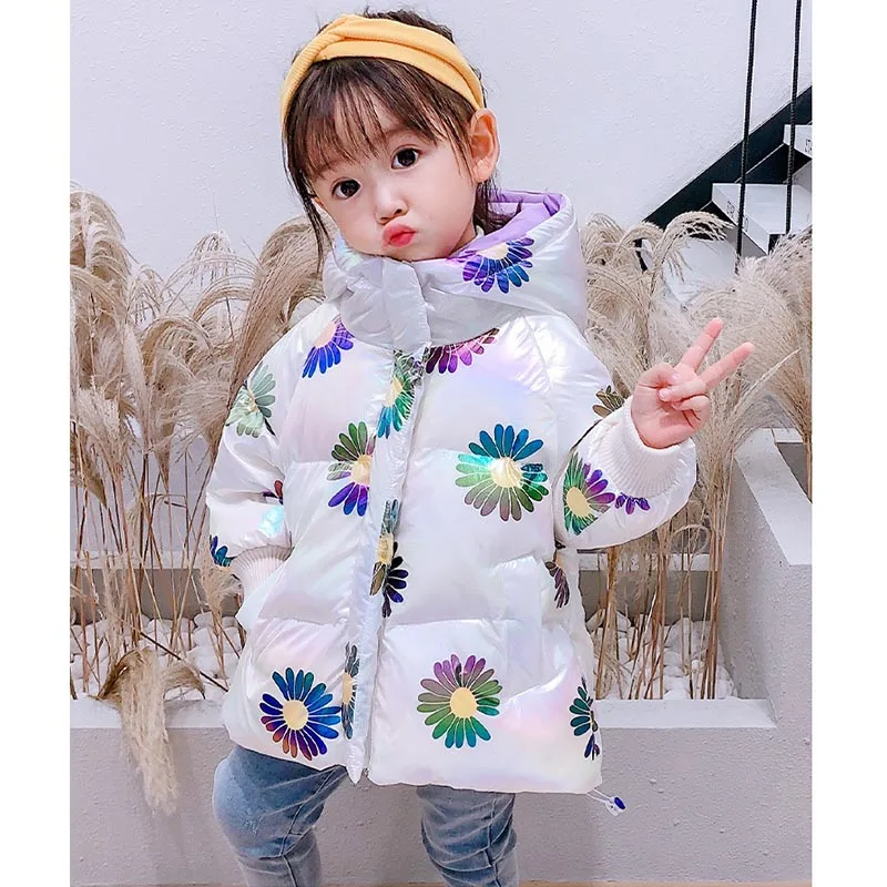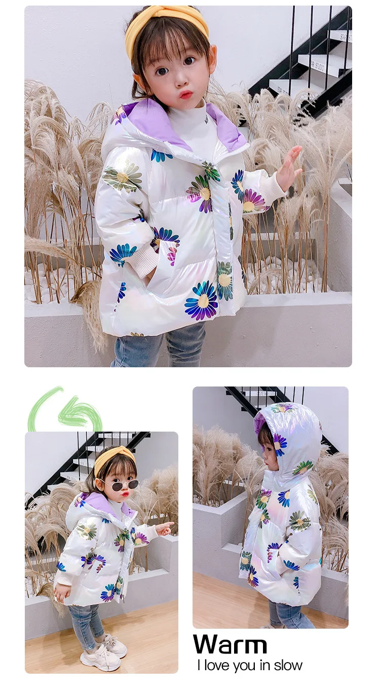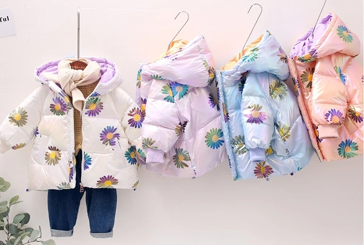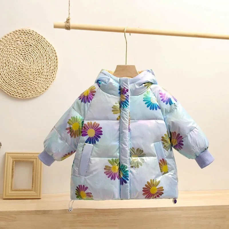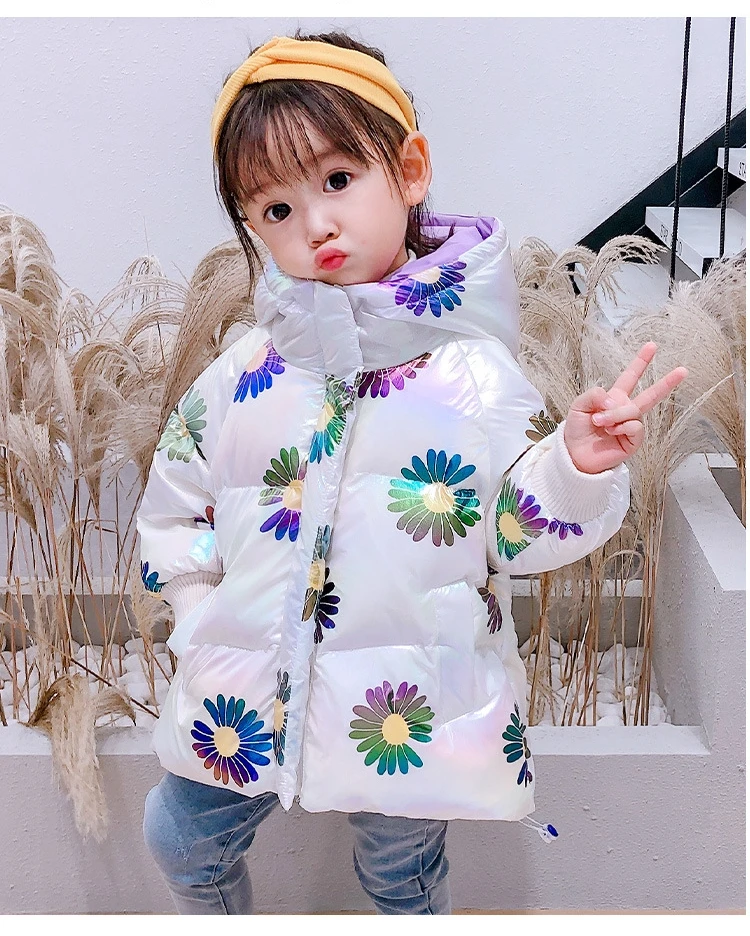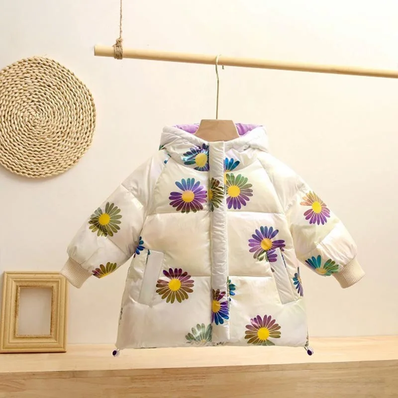 Зимний пуховик для девочек верхняя одежда с капюшоном и цветочным узором для маленьких детей Детское хлопковое пальто с ромашками теплая плотная одежда для маленьких мальчиков