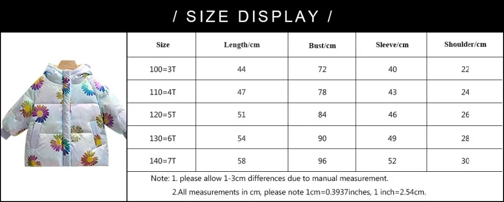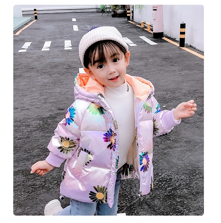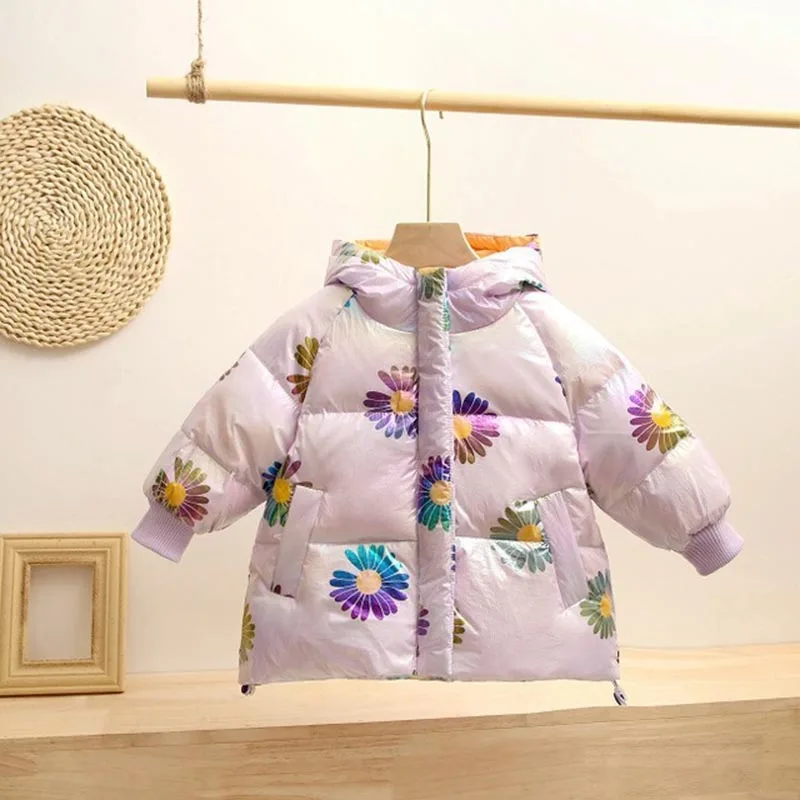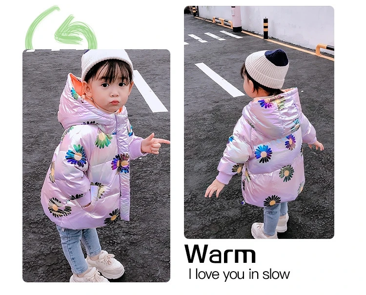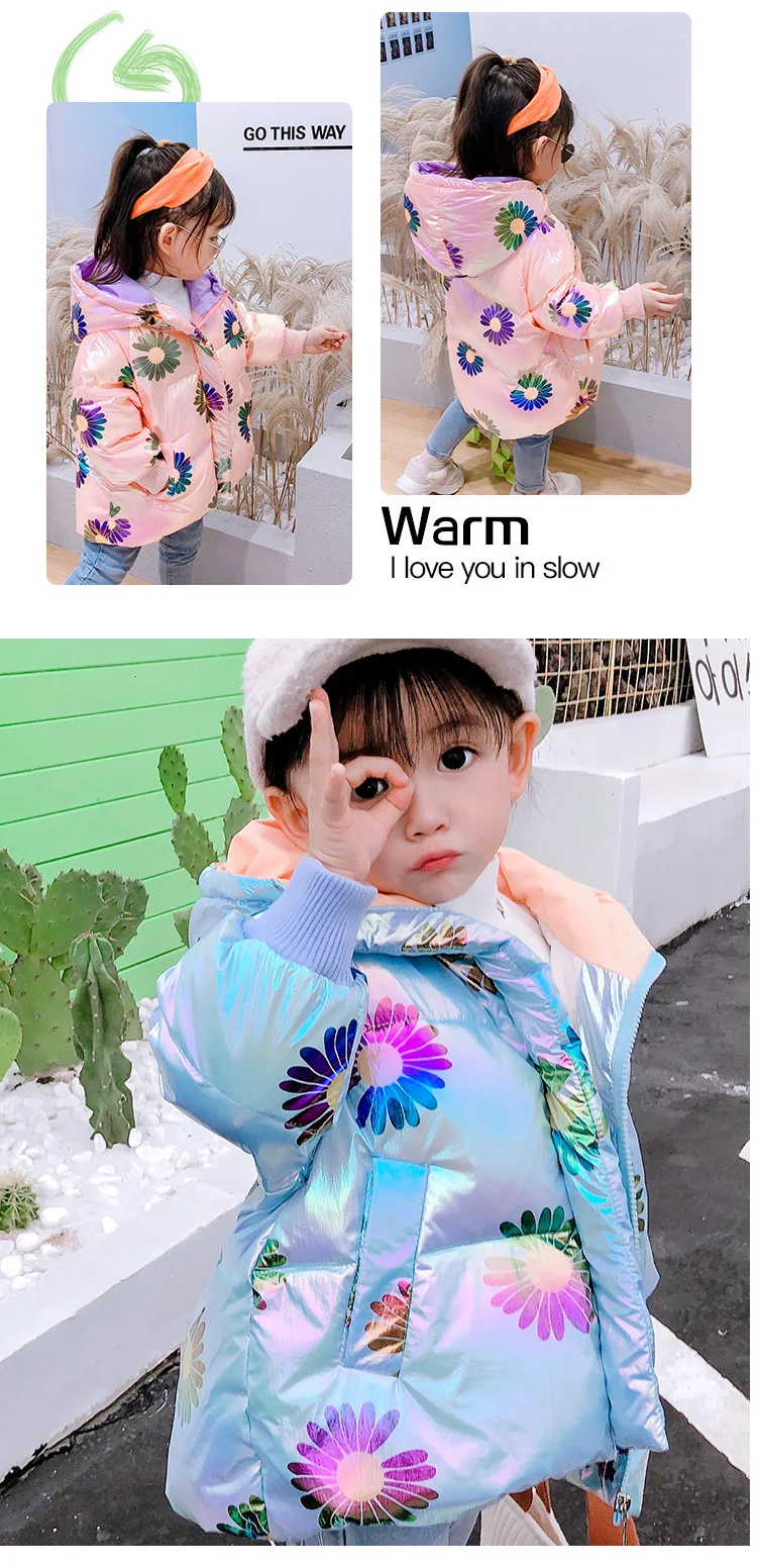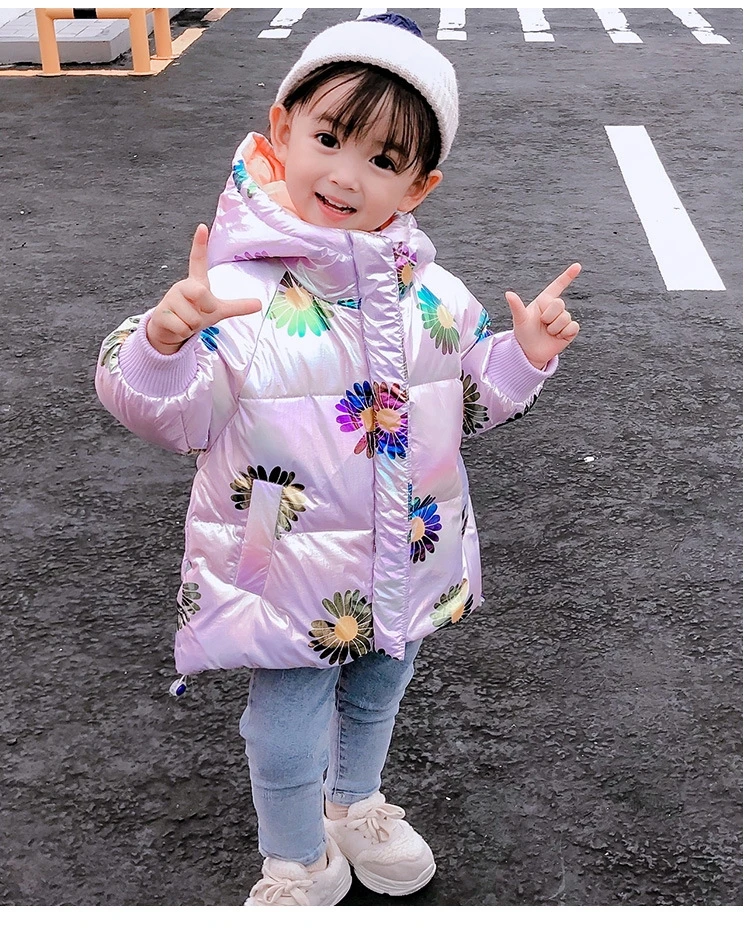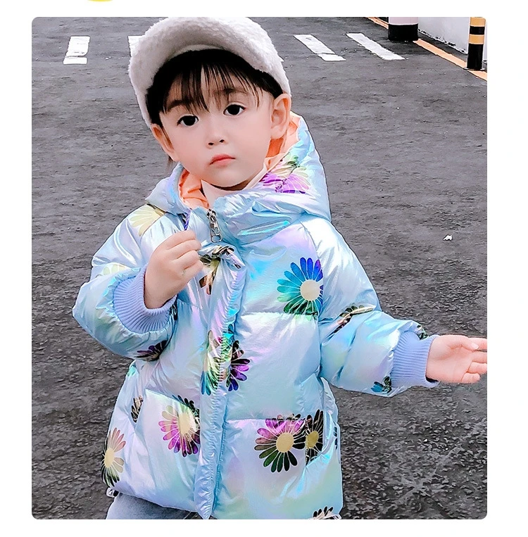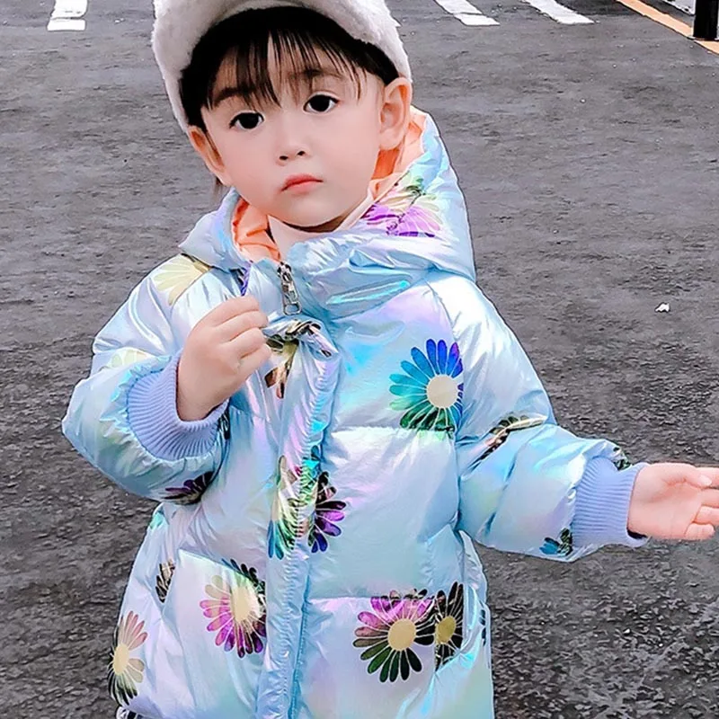 Зимний пуховик для девочек верхняя одежда с капюшоном и цветочным узором для маленьких детей Детское хлопковое пальто с ромашками теплая плотная одежда для маленьких мальчиков